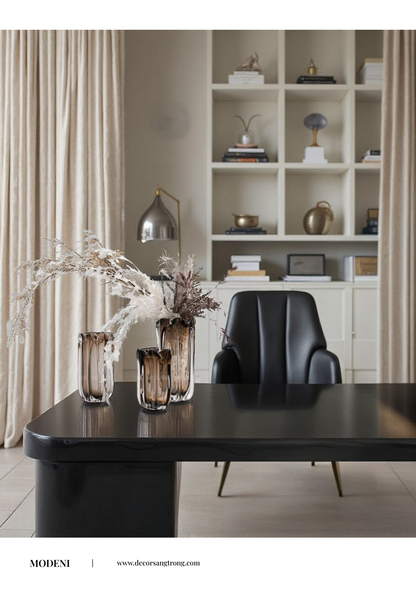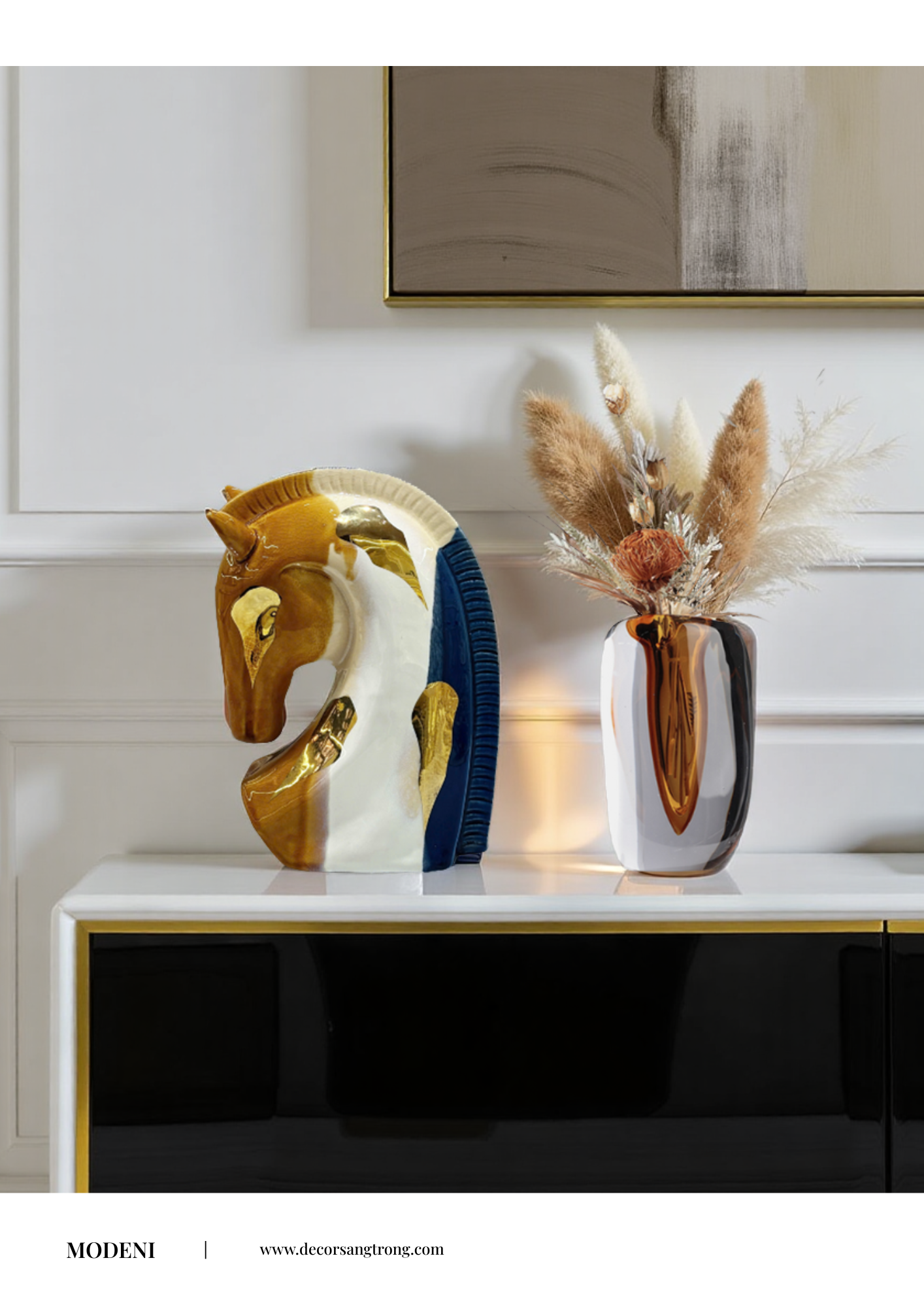 Gợi ý set decor: Tượng Diva, Bình hoa Luminous màu nâu Hổ Phách hiện đại, Tượng Regal Stride tạo nên sự phá cách và gây ấn tượng cho không gian.