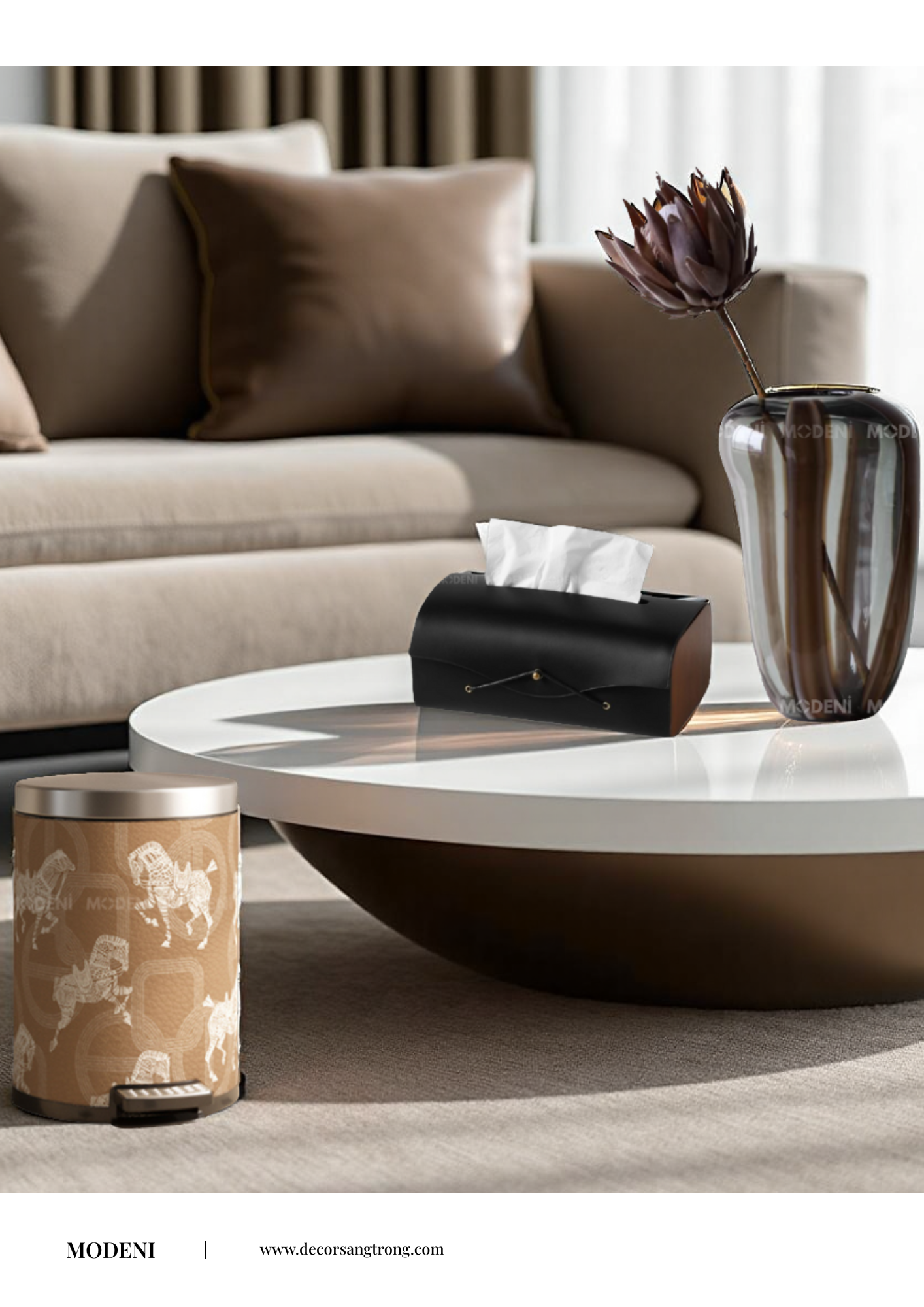 Gợi ý set decor: Bình Ambra nâu đậm, thùng rác Morgan – vừa tiện dụng, vừa đẹp mắt.