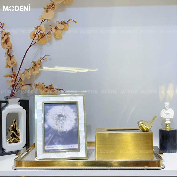 Hãy tưởng tượng một tủ đầu giường gỗ veneer, trên đó là chiếc đồng hồ vuông đế đá, hay một tượng nghệ thuật trừu tượng ánh vàng mờ – không ồn ào nhưng hút mắt.