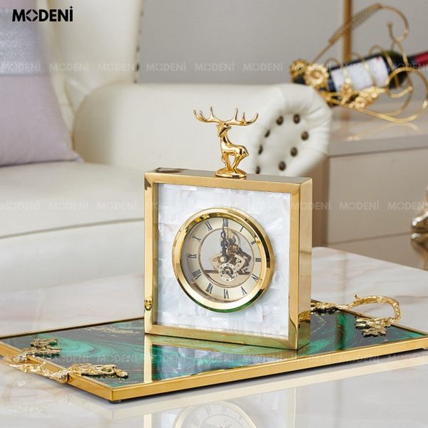 Thiết kế mặt số La Mã, khung kim loại ánh kim, phối đá hoặc tượng nhỏ phía trên.
