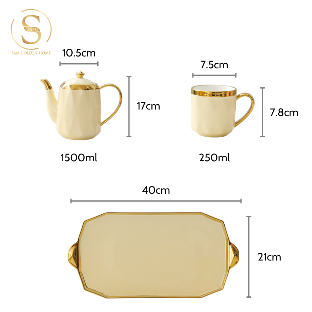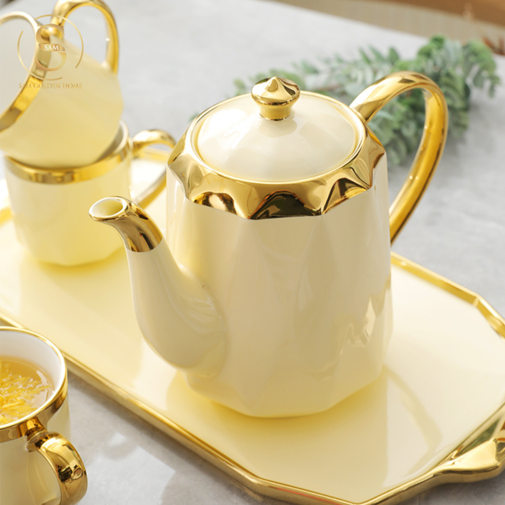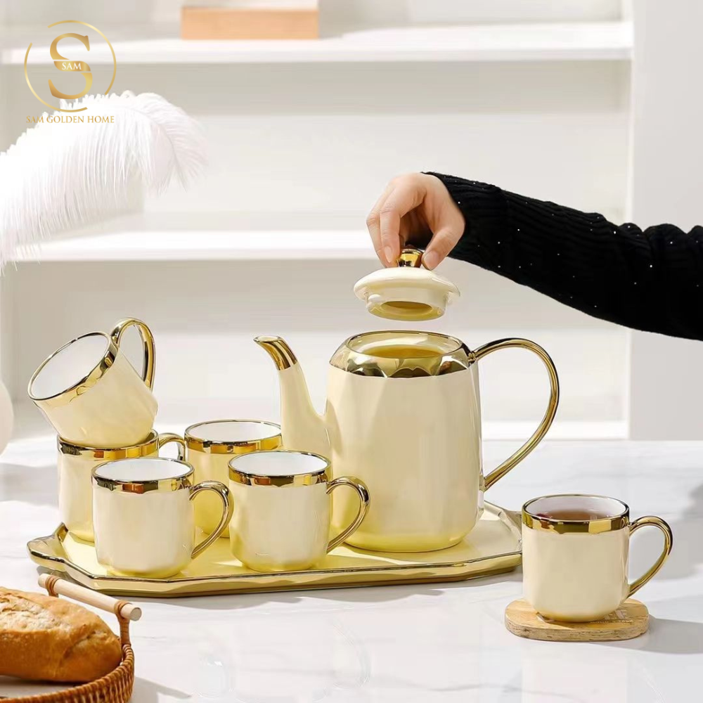 Bộ Ấm Trà Shein Gốm Sứ Cao Cấp Màu Kem Viền Vàng Sang Trọng Kèm Khay Đựng Hiện Đại