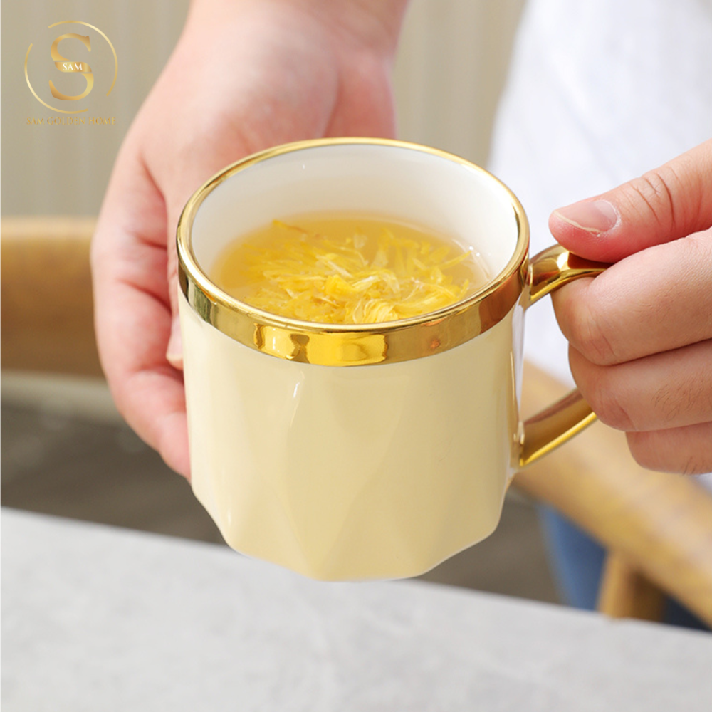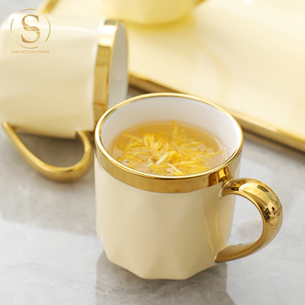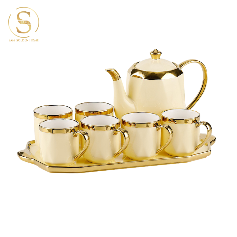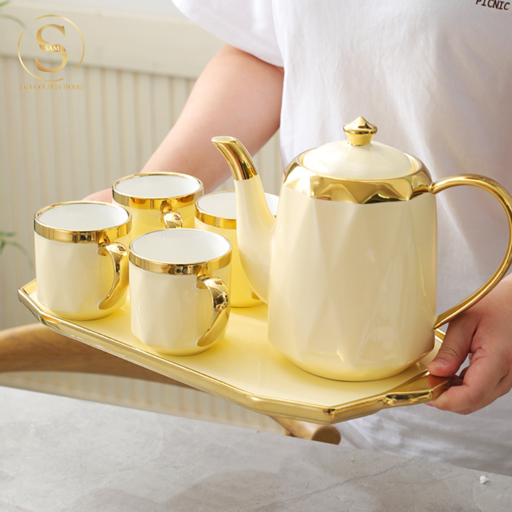 Bộ Ấm Trà Shein Gốm Sứ Cao Cấp Màu Kem Viền Vàng Sang Trọng Kèm Khay Đựng Hiện Đại