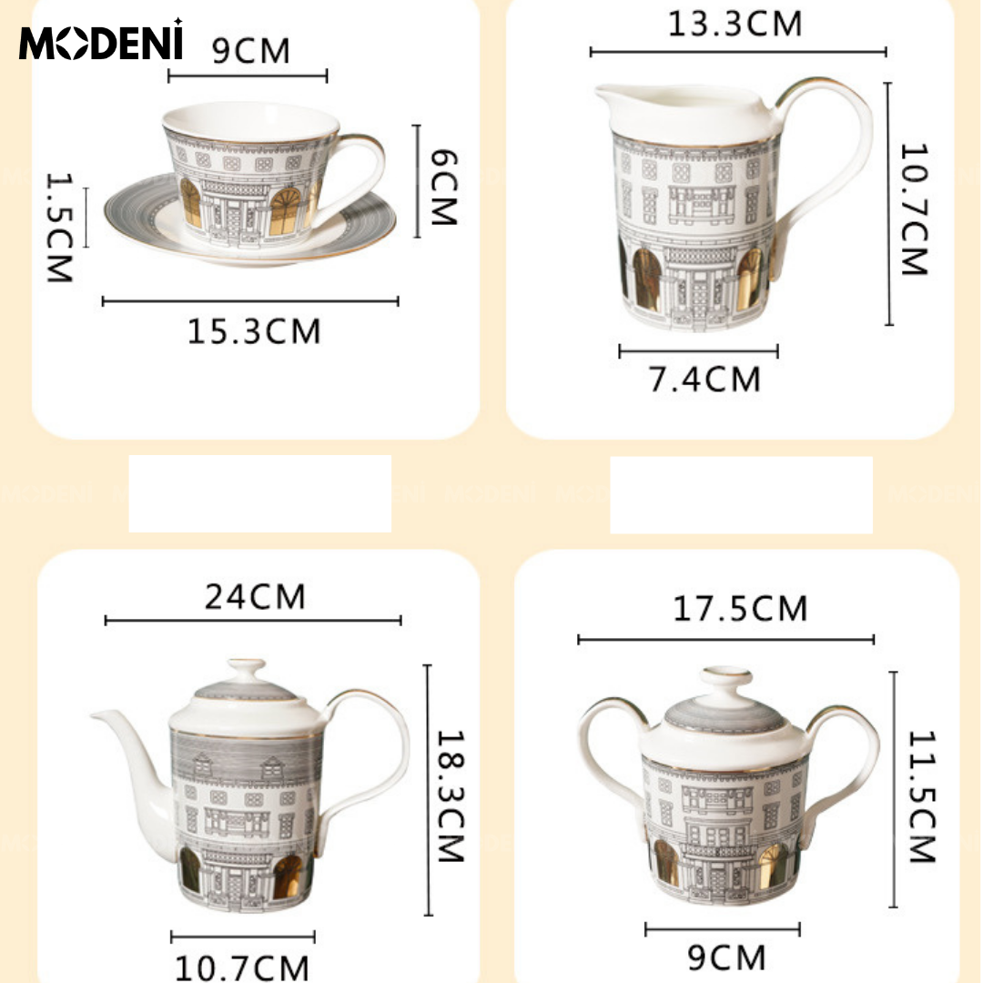 | Bao gồm1 | 1 Bình trà, 1 Bình đường, 1 Bình sữa, 4 Tách trà, 4 Đĩa tách |