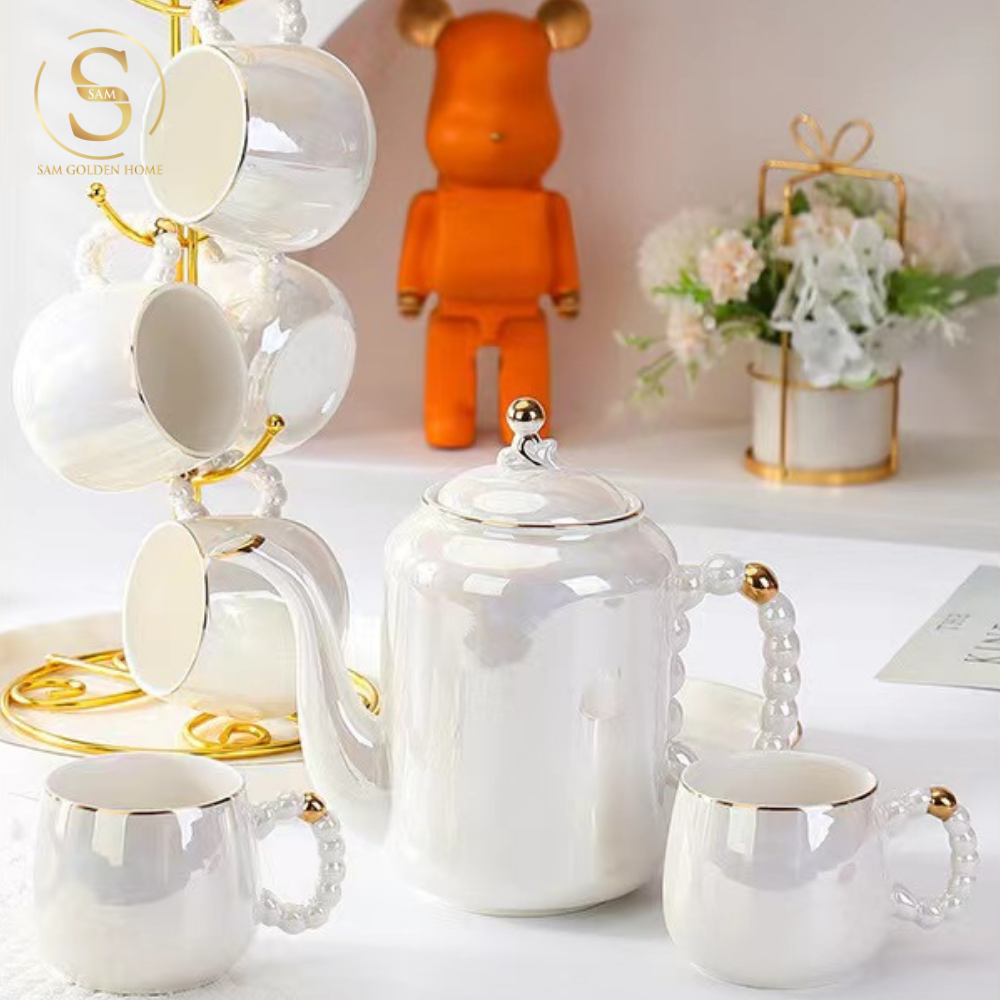 Bộ Bình Trà Pearly Sứ Xương Cao Cấp Sang Trọng | Kèm Khay | Kèm Giá Treo Ly