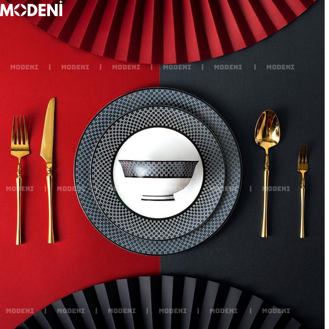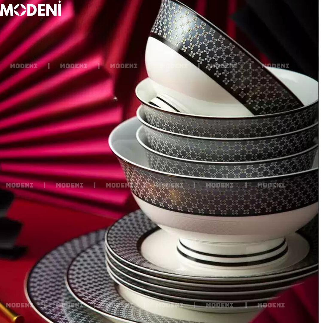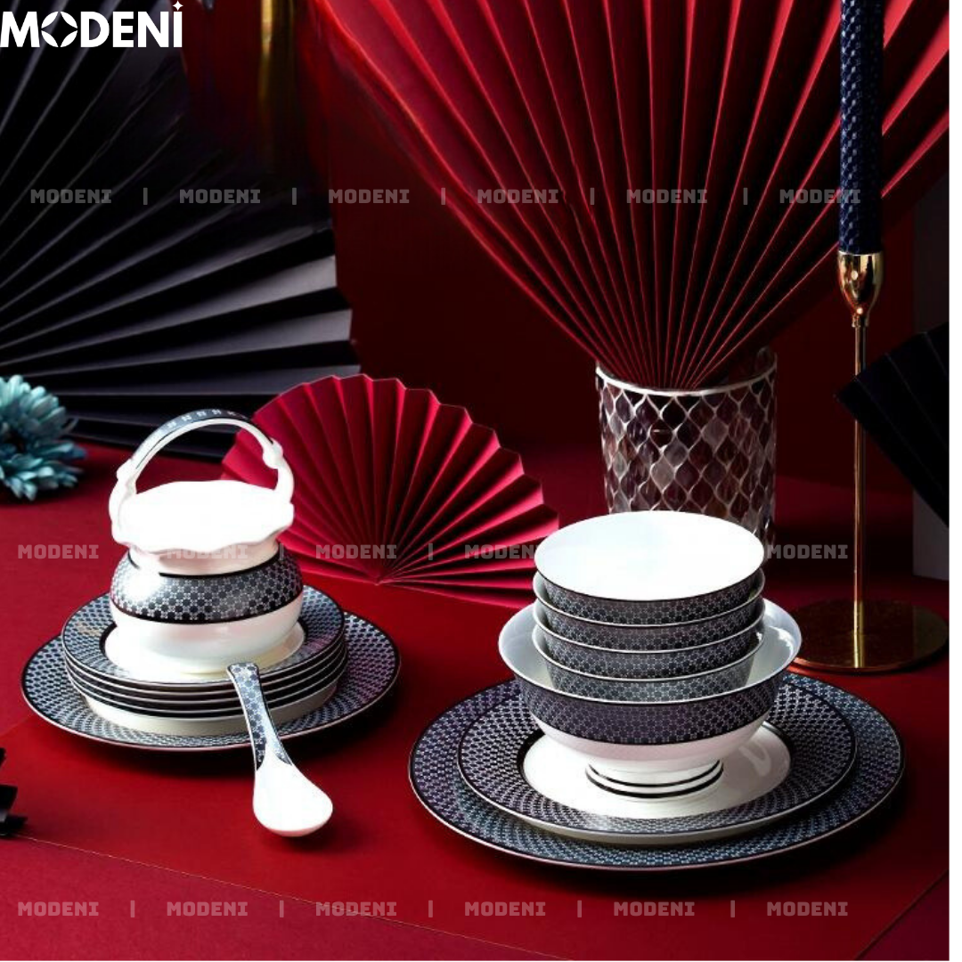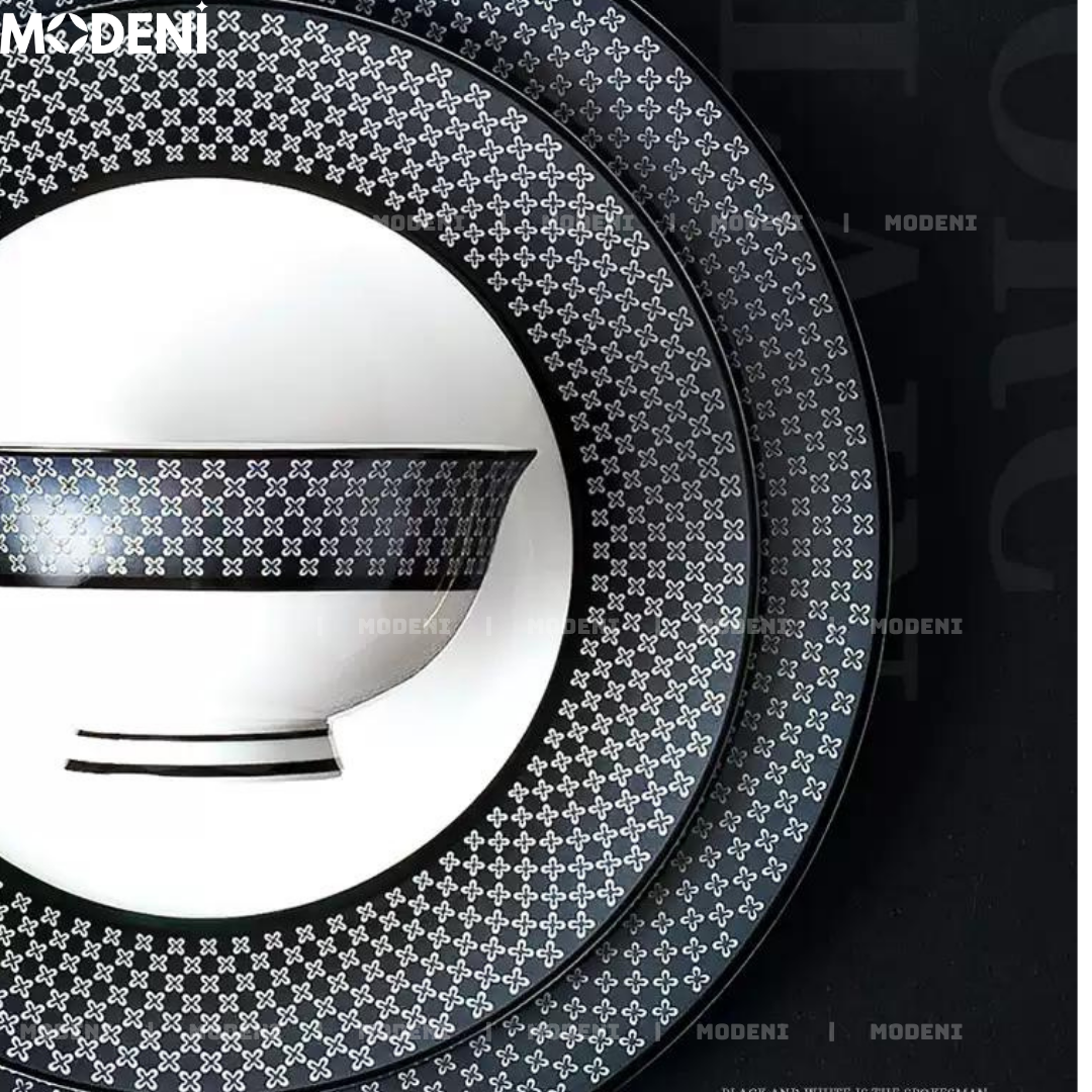 Bộ Chén Đĩa Sứ Xương Hailey Cao Cấp Viền Đen Họa Tiết Lưới Sang Trọng - Cho Bàn Ăn Hiện Đại & Tiếp Khách