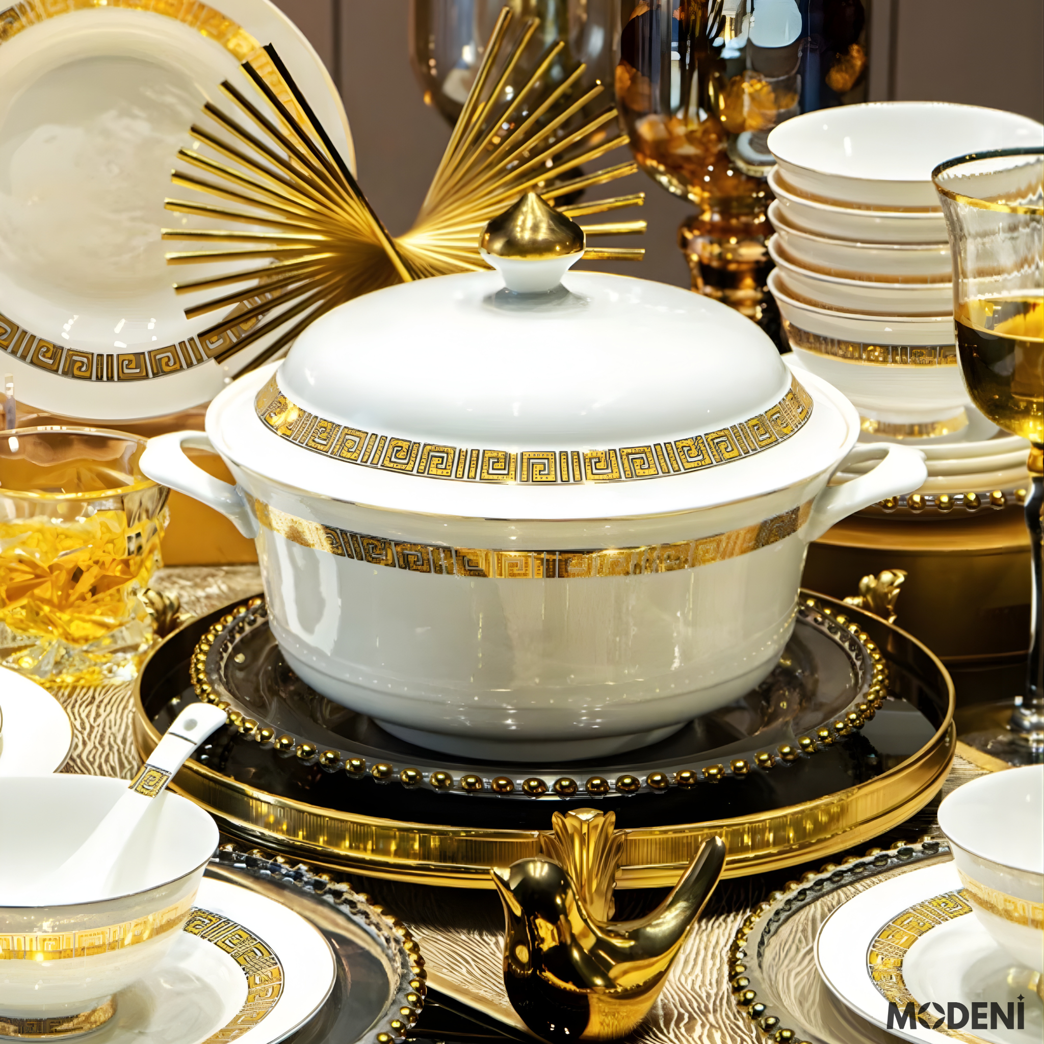 Bộ Chén Đĩa Sứ Xương Trevi Cao Cấp Viền Vàng Ánh Kim – Nghệ Thuật Hoàng Gia Cho Bàn Ăn Hiện Đại