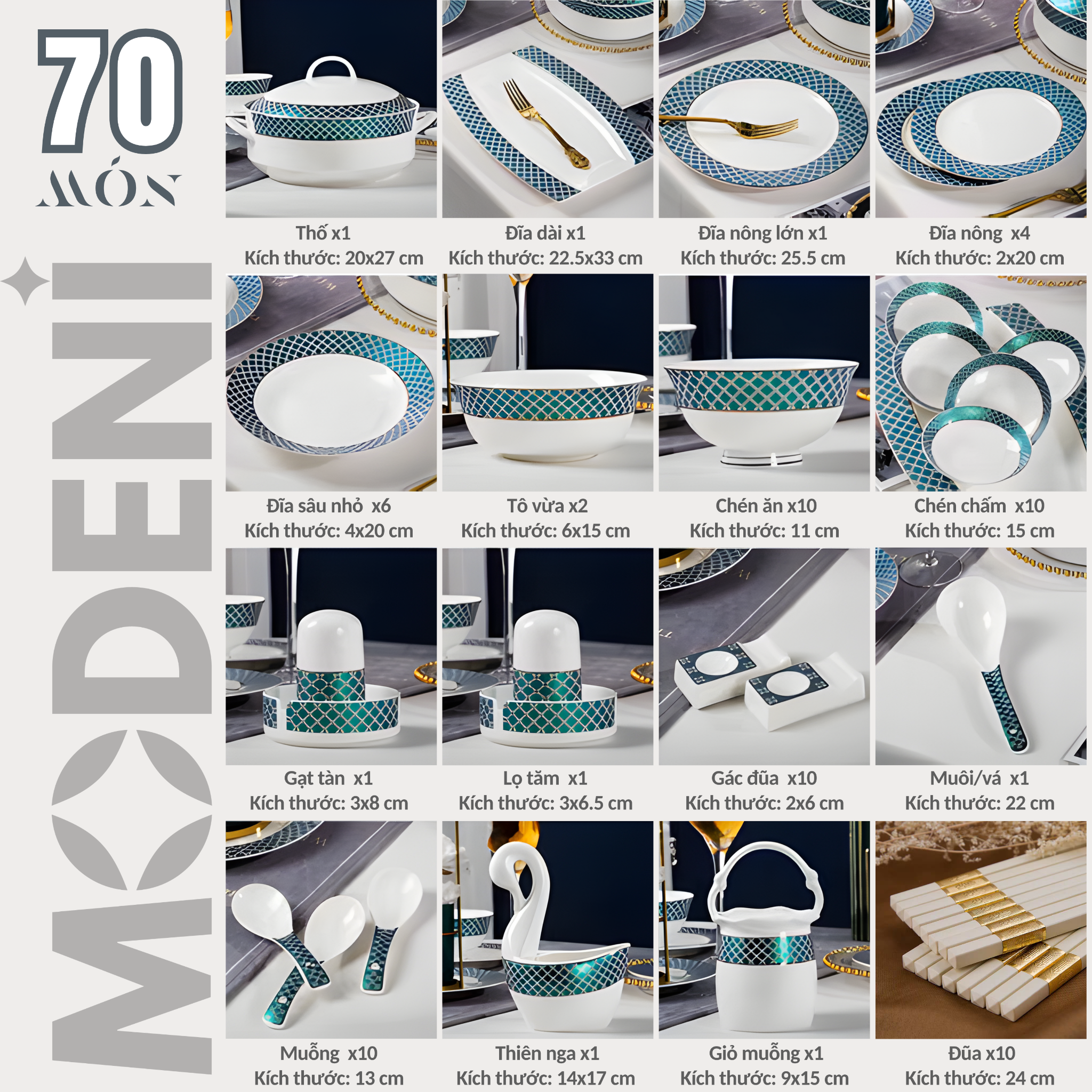 Bộ 70 món: Nồi thố x1, Đĩa dài x1, Đĩa nông lớn x1, Đĩa sâu vừa x6, Đĩa nông vừa x4, Muỗng sứ x10, Muôi sứ x1, Chén chấm x10, Chén cơm x10, Đôi đũa x10, Giỏ hoa đựng muỗng x1, Thiên nga đựng muôi x1, Gạt tàn x1, Lọ tăm x1, Tô vừa x2, Gác đũa x10 |