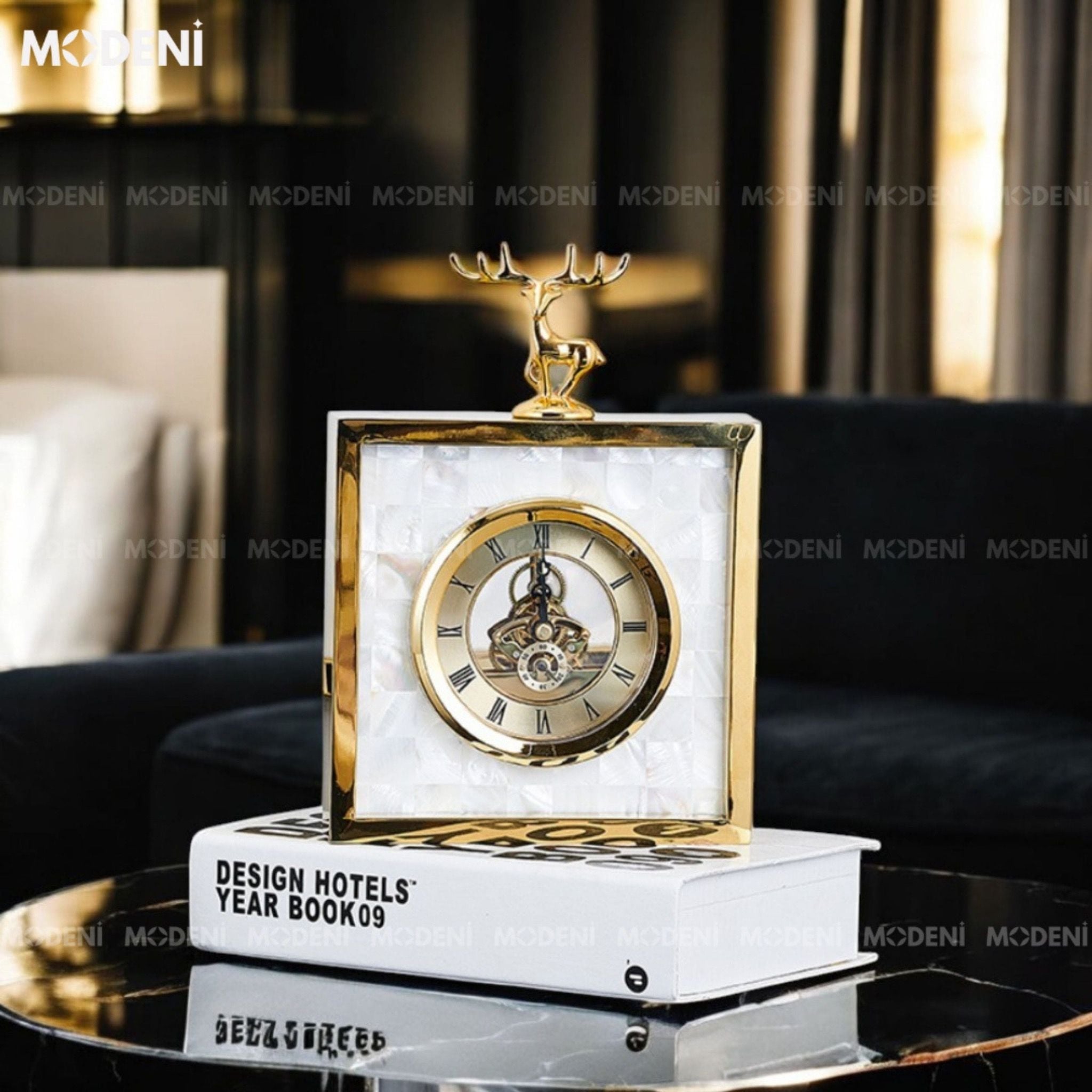Tượng Goldie Decor Hiện Đại – Đồng Hồ Cơ Lộ Máy Mặt Xà Cừ – Trang Trí Bàn Làm Việc & Kệ Sách Phong Cách Nghệ Thuật