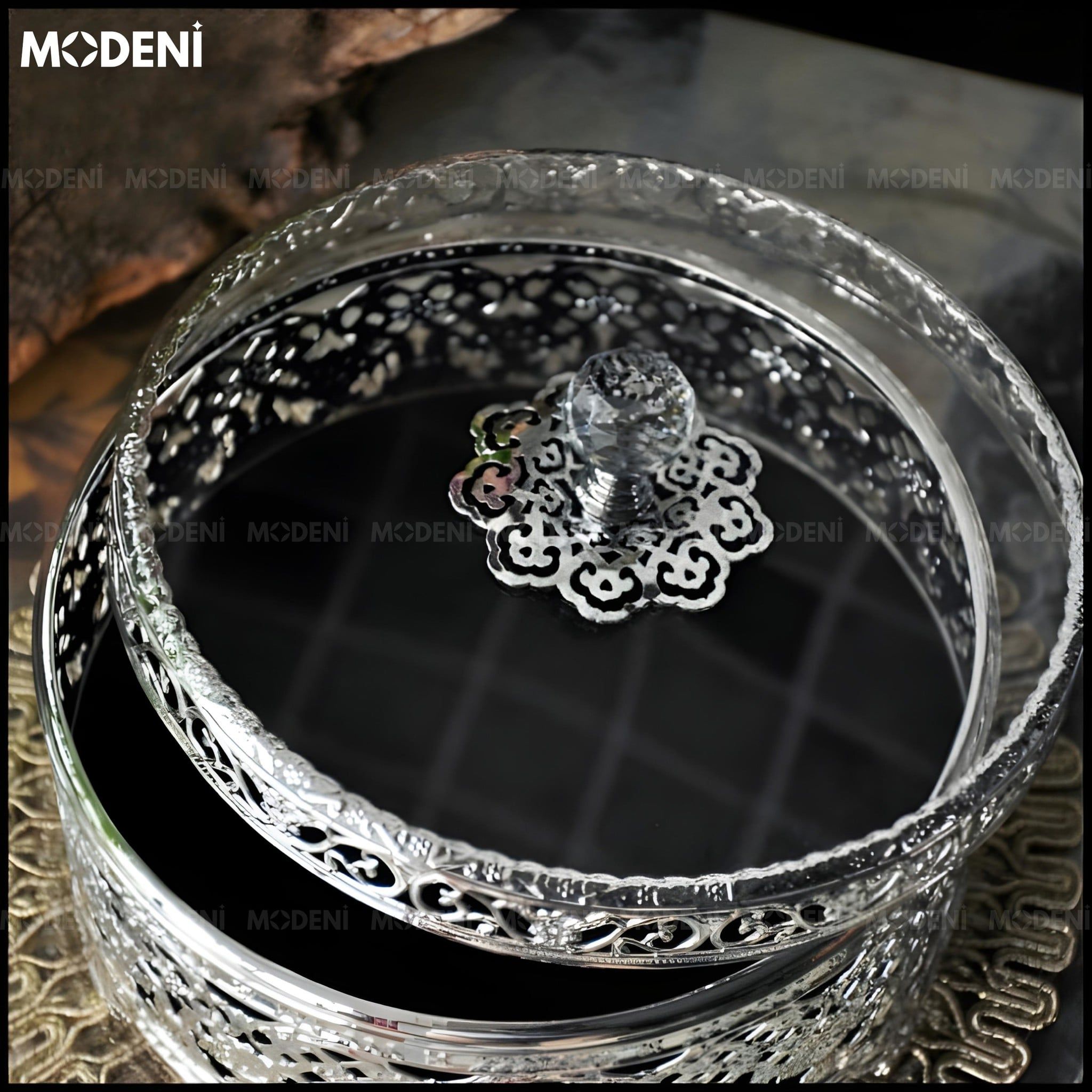 | Chất liệu | Hợp kim kẽm cao cấp với hoa văn đục tinh xảo Thân đế acrylic trong suốt – nhẹ, bền Nắp thủy tinh dày với tay cầm pha lê |