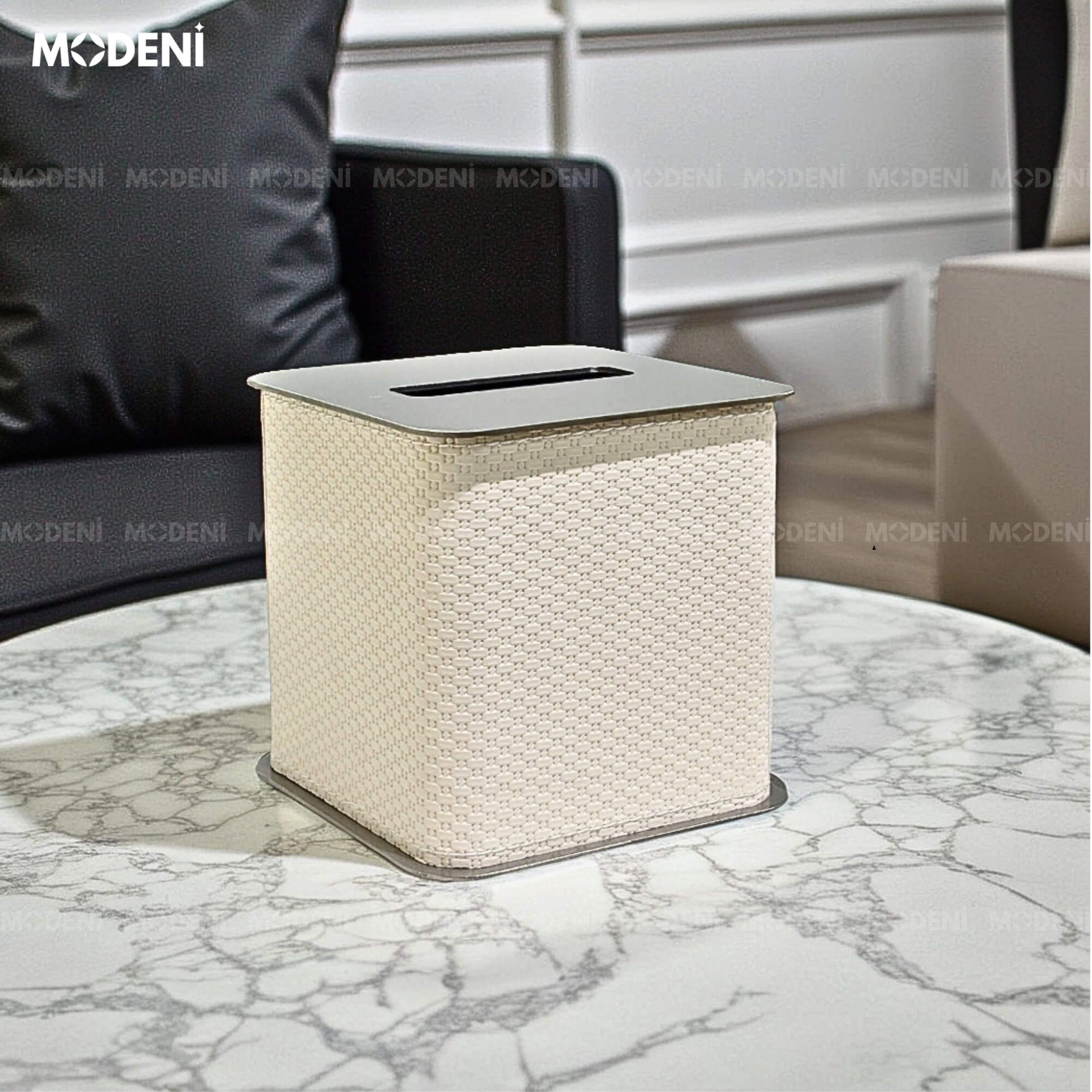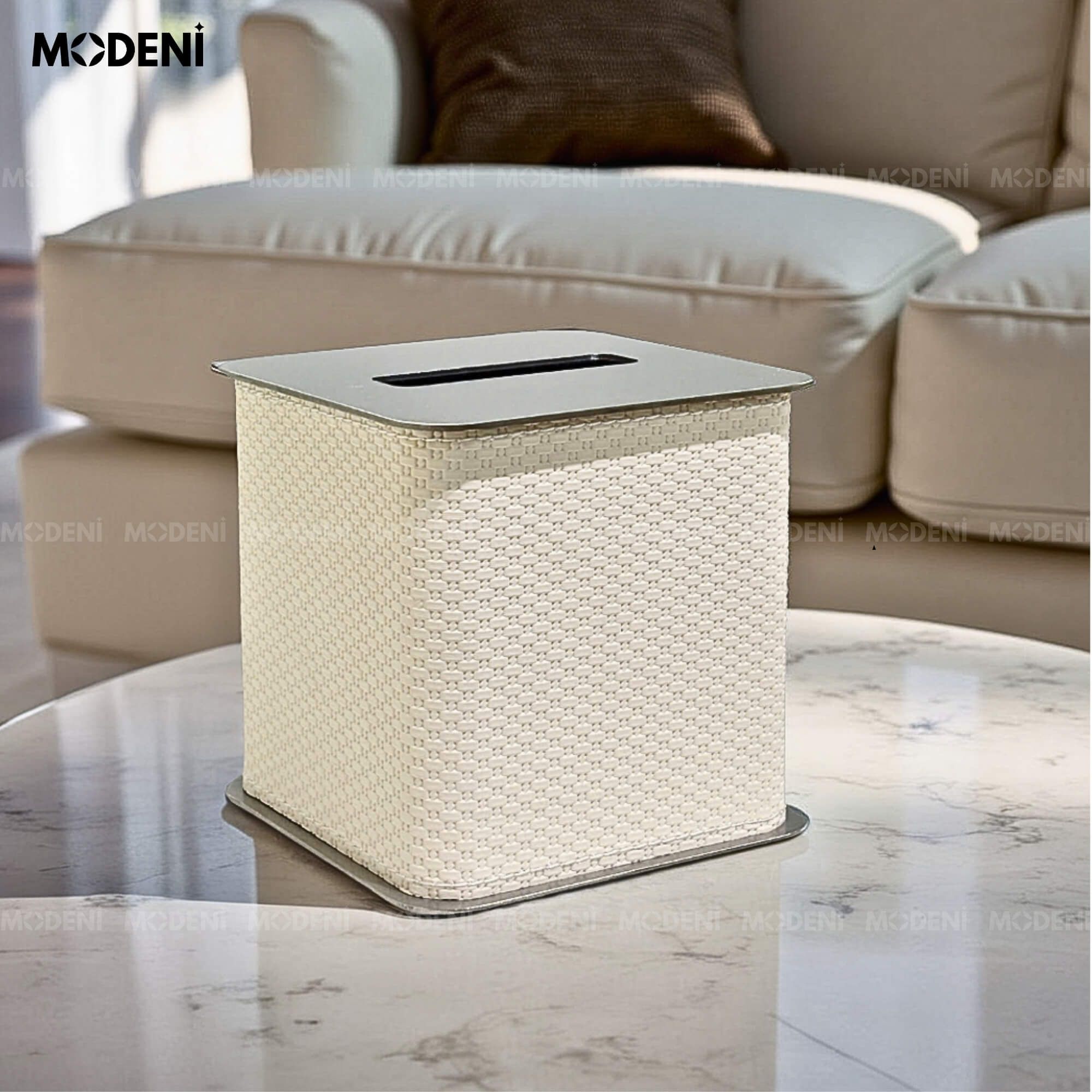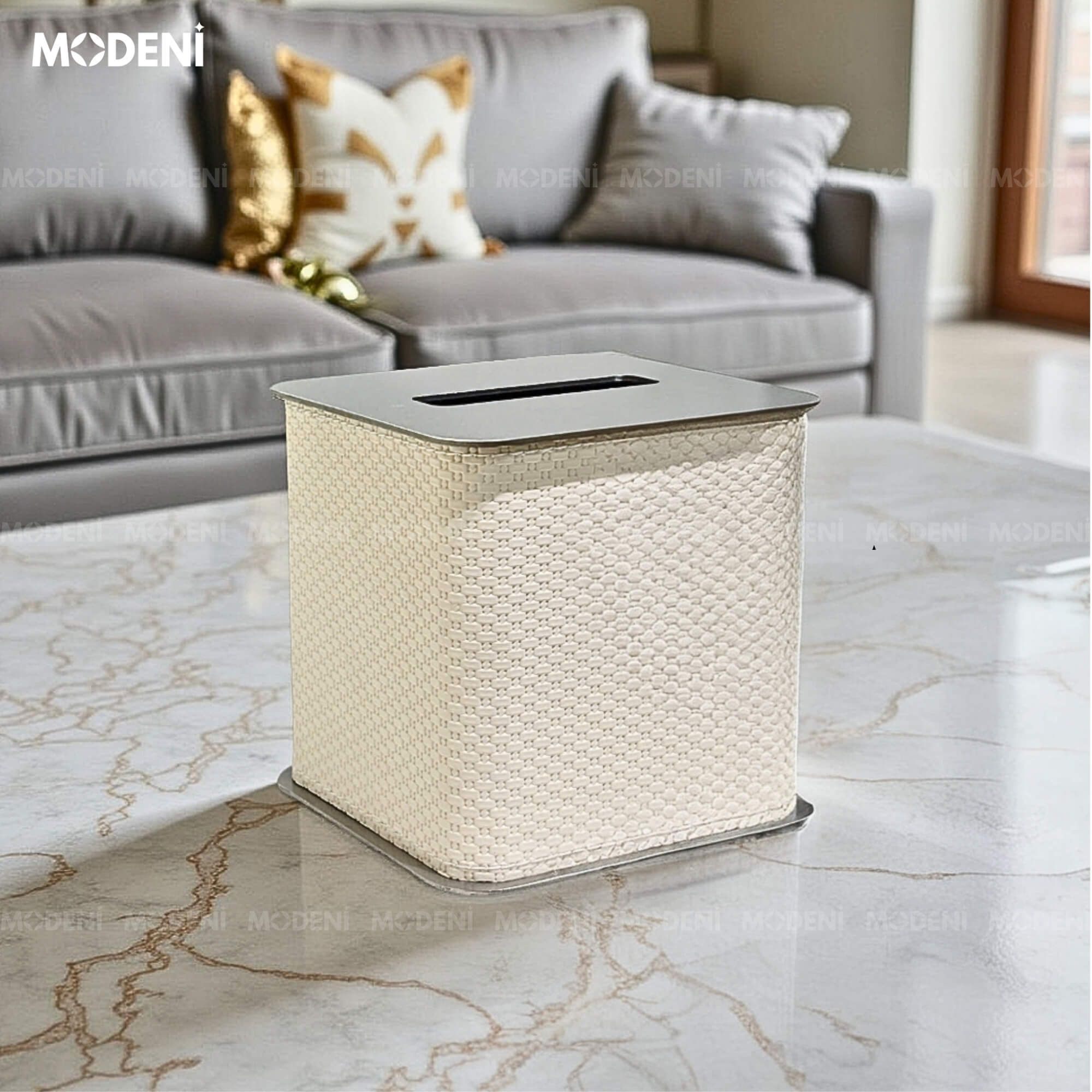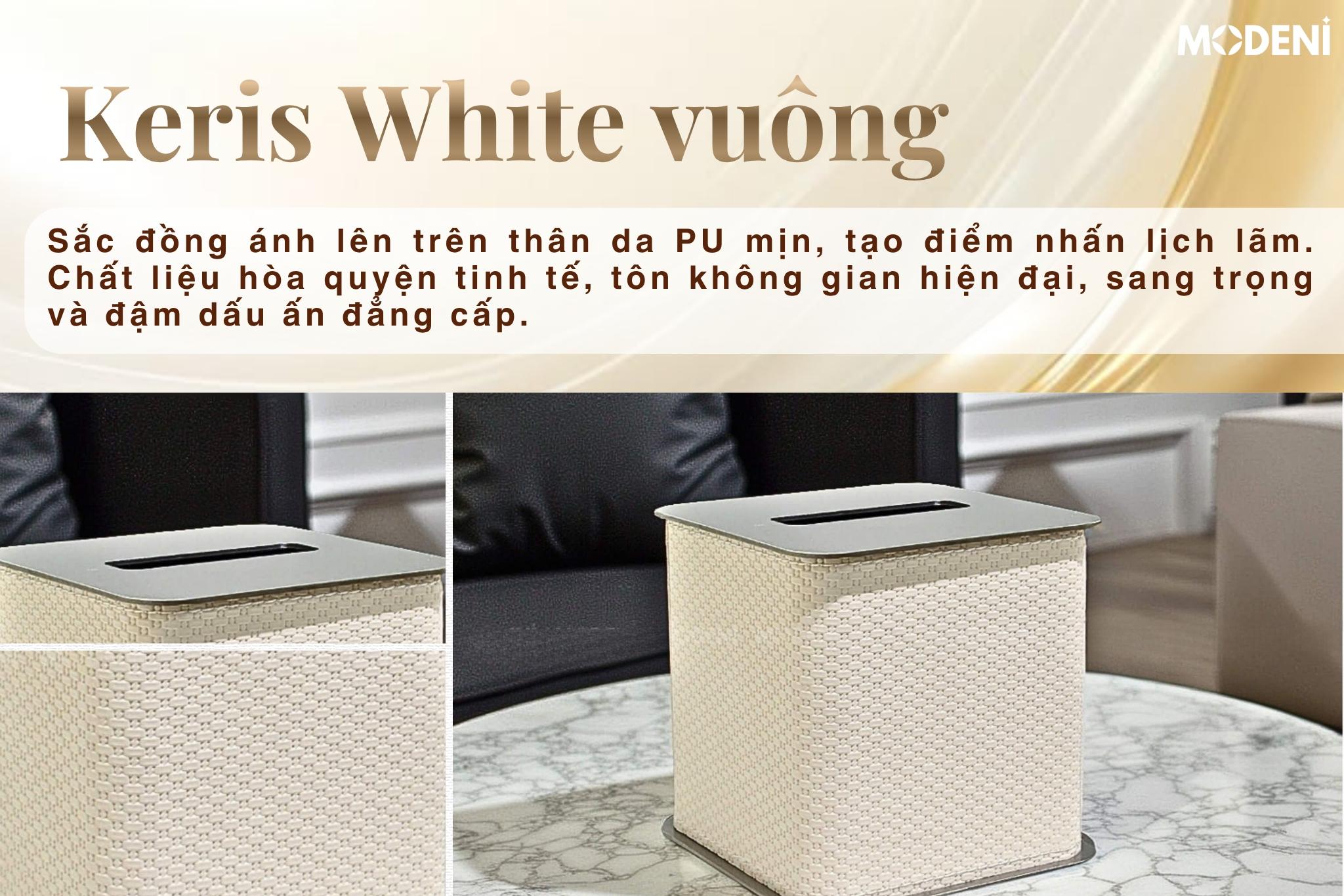 Hộp Khăn Giấy Keris White Vuông Da PU Cao Cấp Nắp Kim Loại Hiện Đại Cho Phòng Khách, Văn Phòng