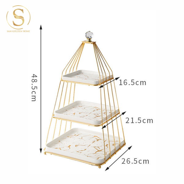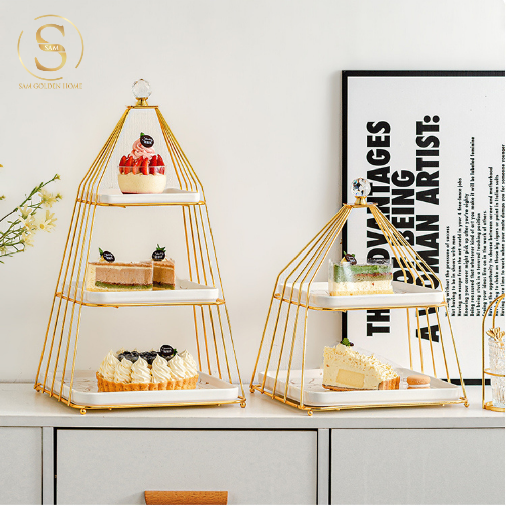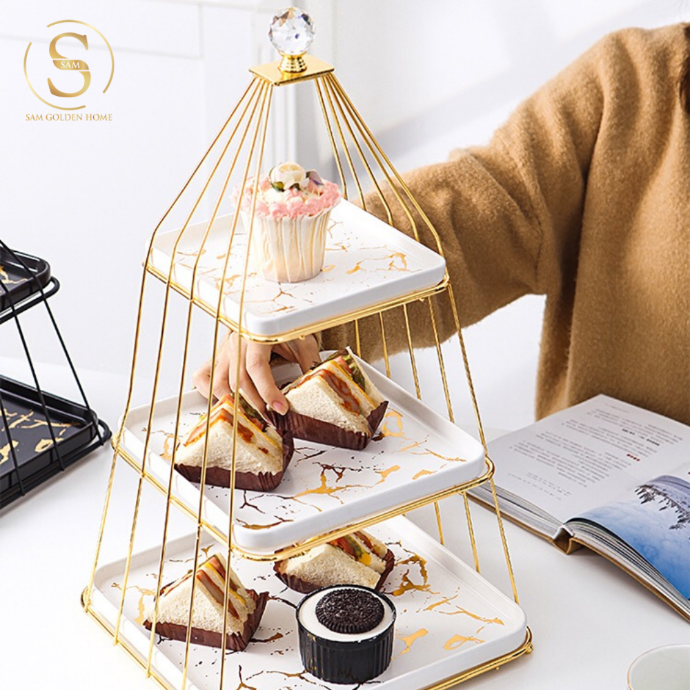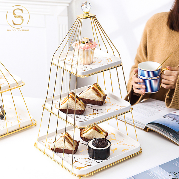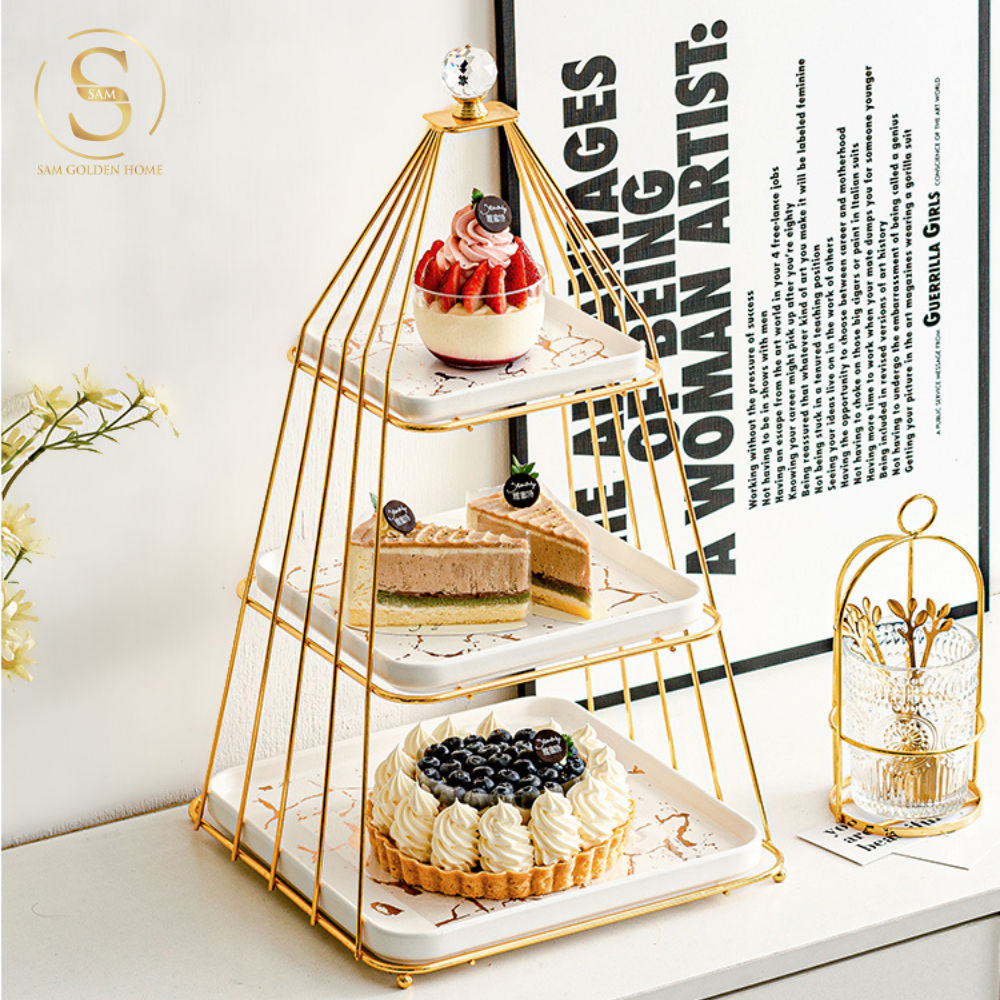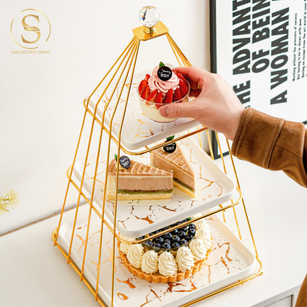 Khay 3 Tầng Bondine – Khung Vàng Đĩa Trắng Marble Sang Trọng, Decor Tiệc Trà Châu Âu