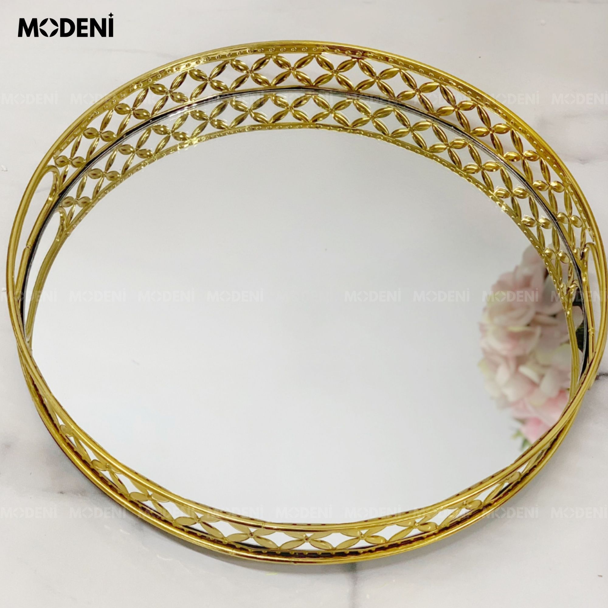 Khay Leona Tròn – Decor Mặt Gương Inox Vàng – Sang Trọng, Tinh Tế, Đậm Chất Châu Âu Cổ Điển Cho Bàn Trang Điểm, Sofa, Console