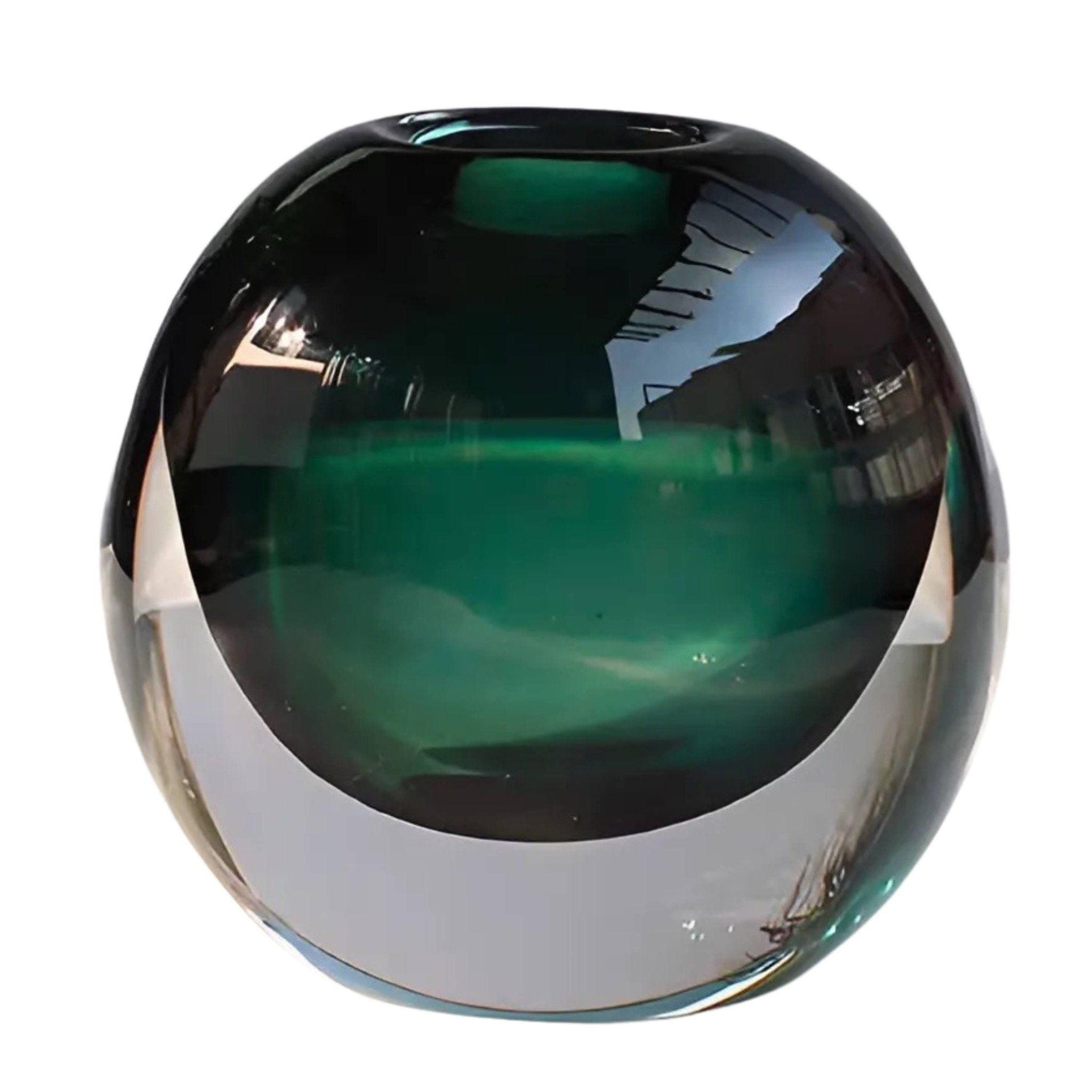 Lọ Hoa Thủy Tinh Mila Màu Xanh Lục – Decor Nghệ Thuật Độc Đáo – Dáng Tròn 14x14cm Cho Bàn Sofa Sang Trọng