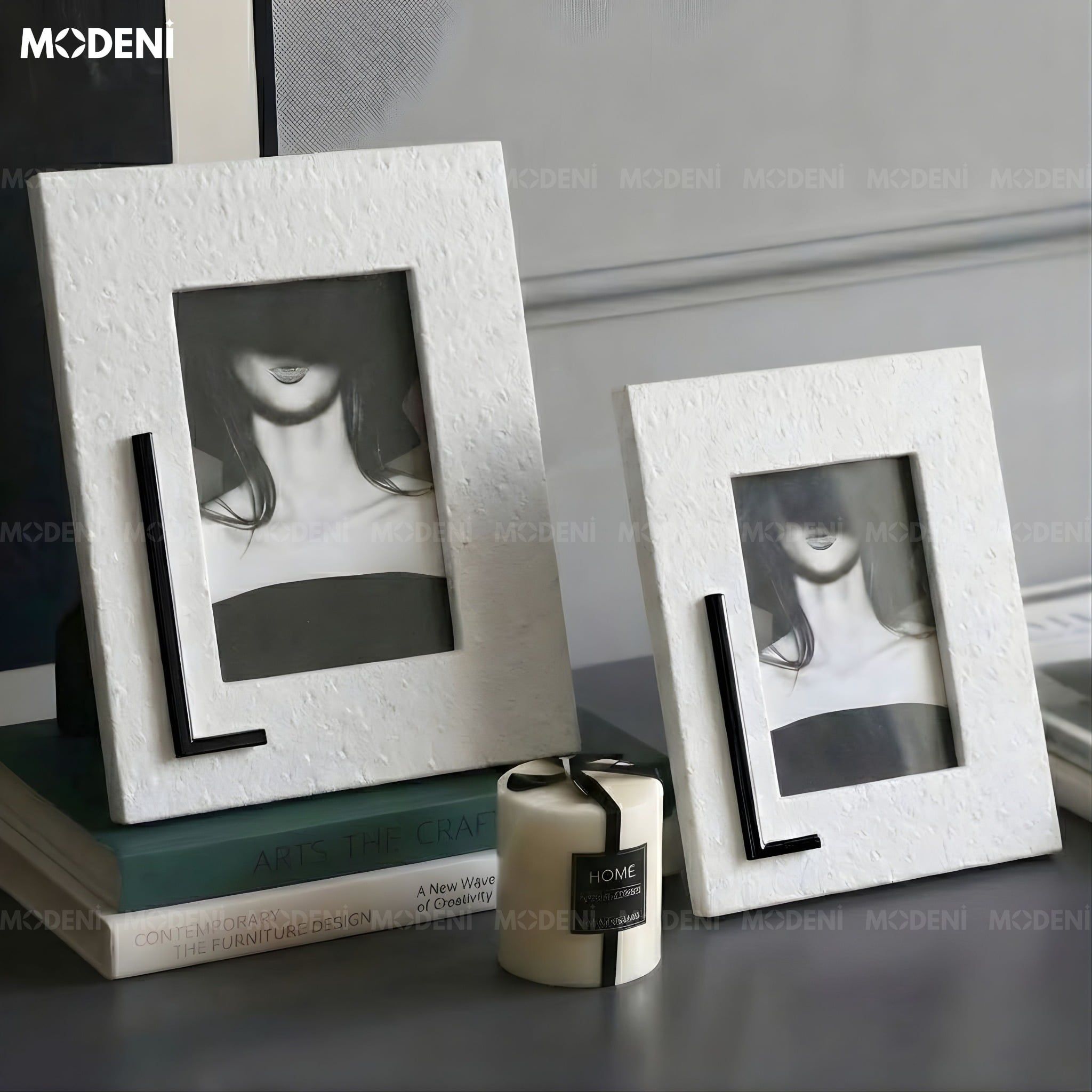 Set Khung Ảnh Deni Trắng Họa Tiết Vân Da Đà Điểu Phối Kim Loại Cao Cấp Cho Bàn Console Hiện Đại Sang Trọng