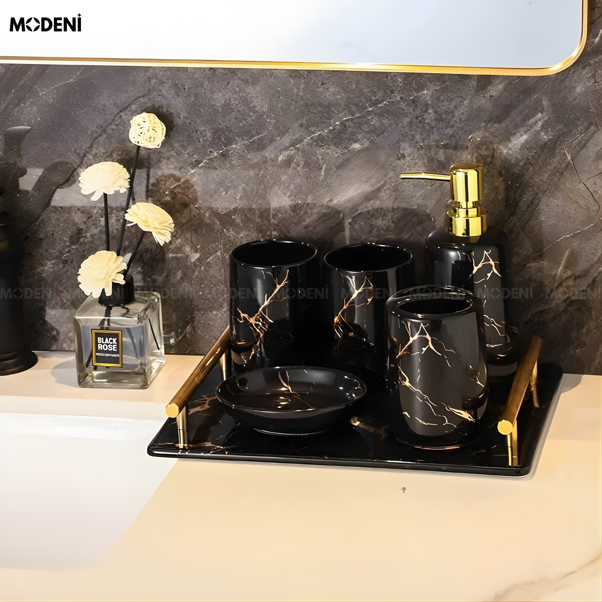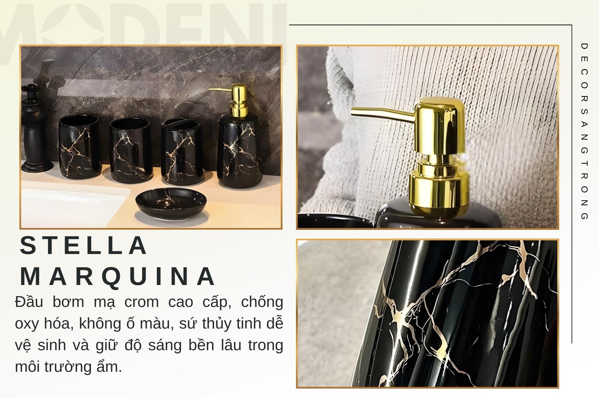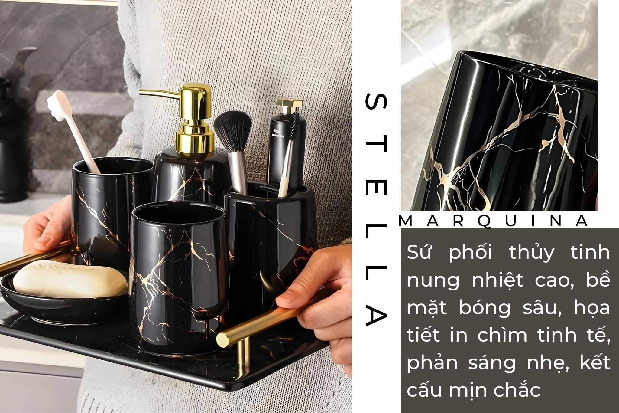Set Đồ Dùng Nhà Tắm Stella Marquina Gốm Sứ Phối Thủy Tinh Họa Tiết Vàng Cẩm Thạch Phòng Tắm – Bàn Lavabo Sang Trọng
