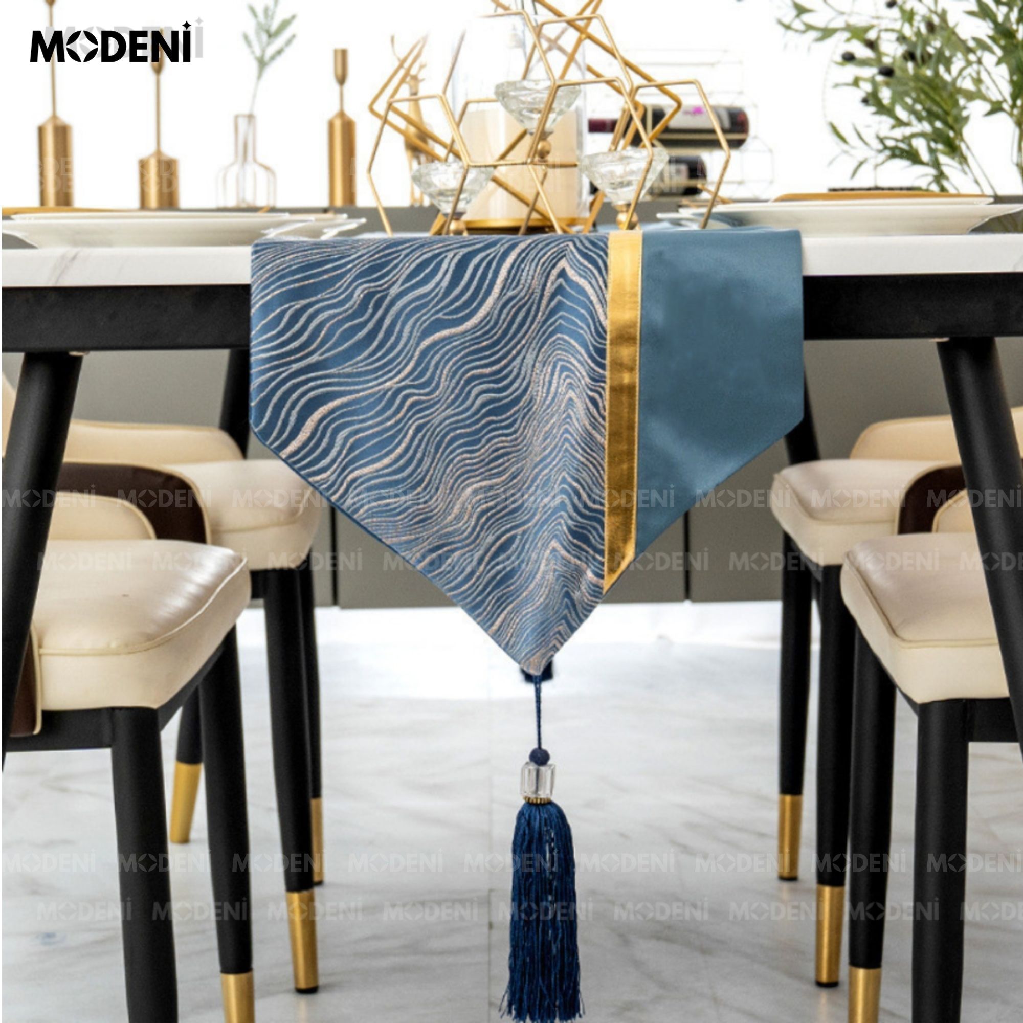Khăn Bàn Table Runner Blue Flowrous Cao Cấp – Luôn Giữ Form Mượt Mà, Hạn Chế Thấm – Họa Tiết Lá Vân Đá Nghệ Thuật – Dành Cho Không Gian Sống Có Gu