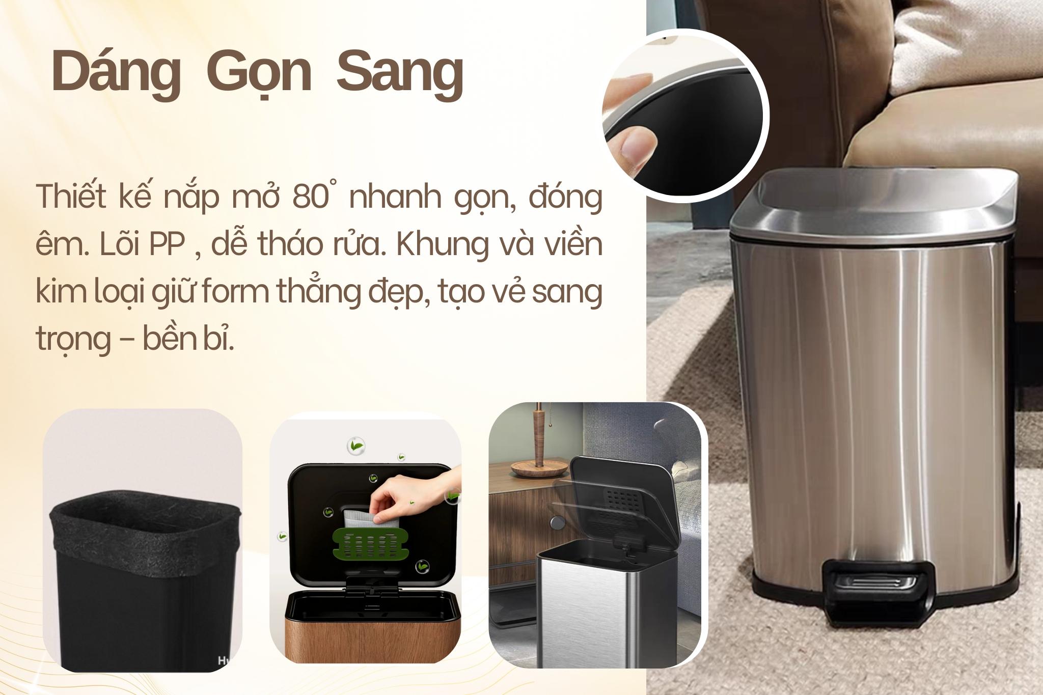 Cơ chế đạp chân tiện lợi, thùng lót rời dễ vệ sinh. |