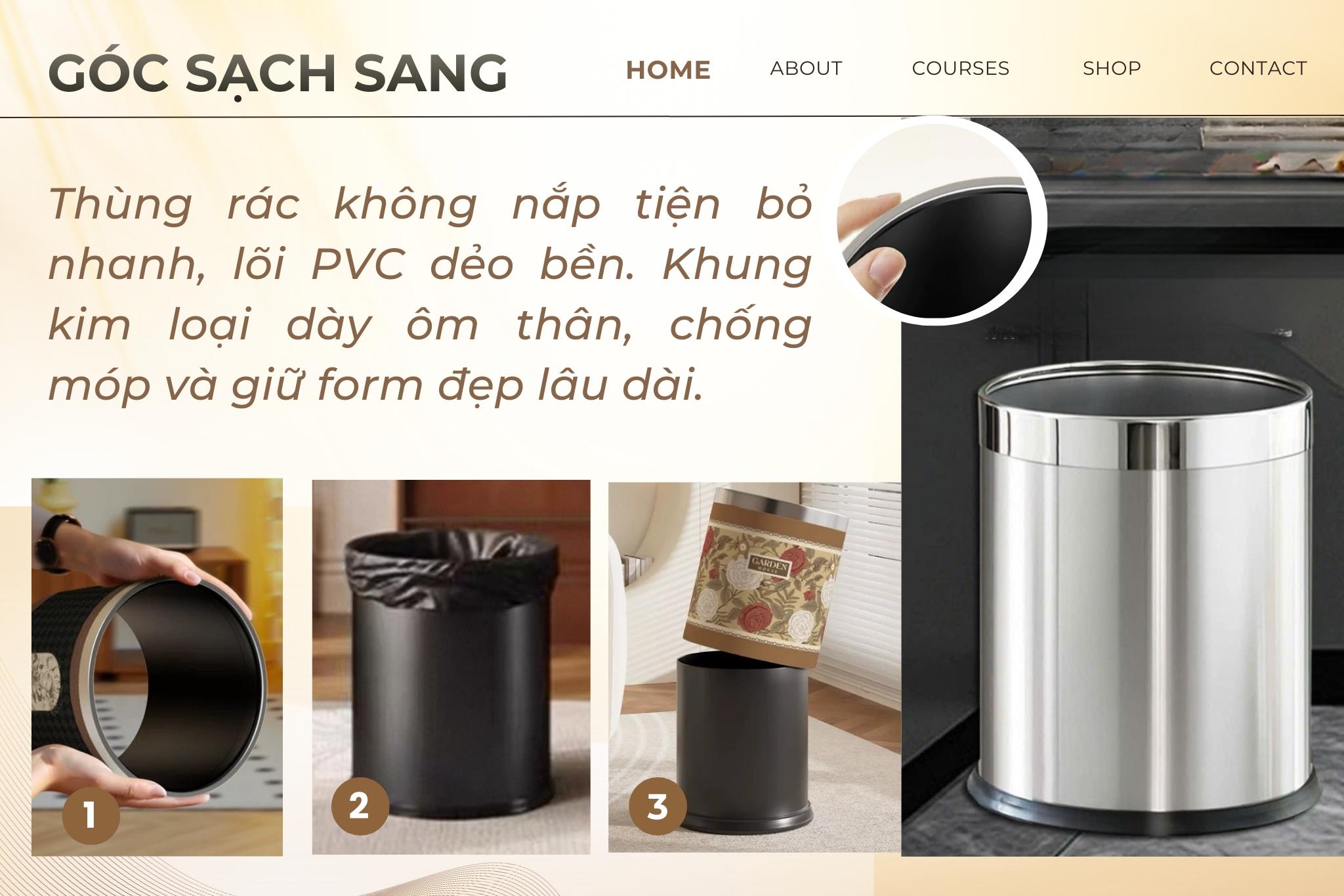 Thiết kế không nắp, tiện lợi cho thao tác bỏ rác nhanh gọn trong không gian khô ráo. Lòng trong là thùng nhựa đen có thể tháo rời – dễ vệ sinh, thay túi. Là vật dụng nội thất trang trí hơn cả một chiếc thùng rác, giúp nâng tầm không gian sống hiện đại – nghệ thuật. |