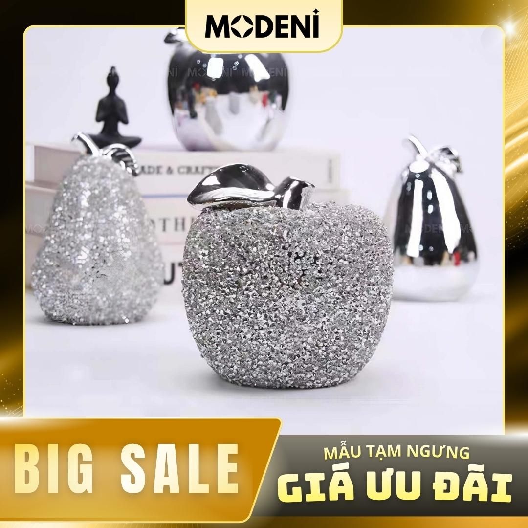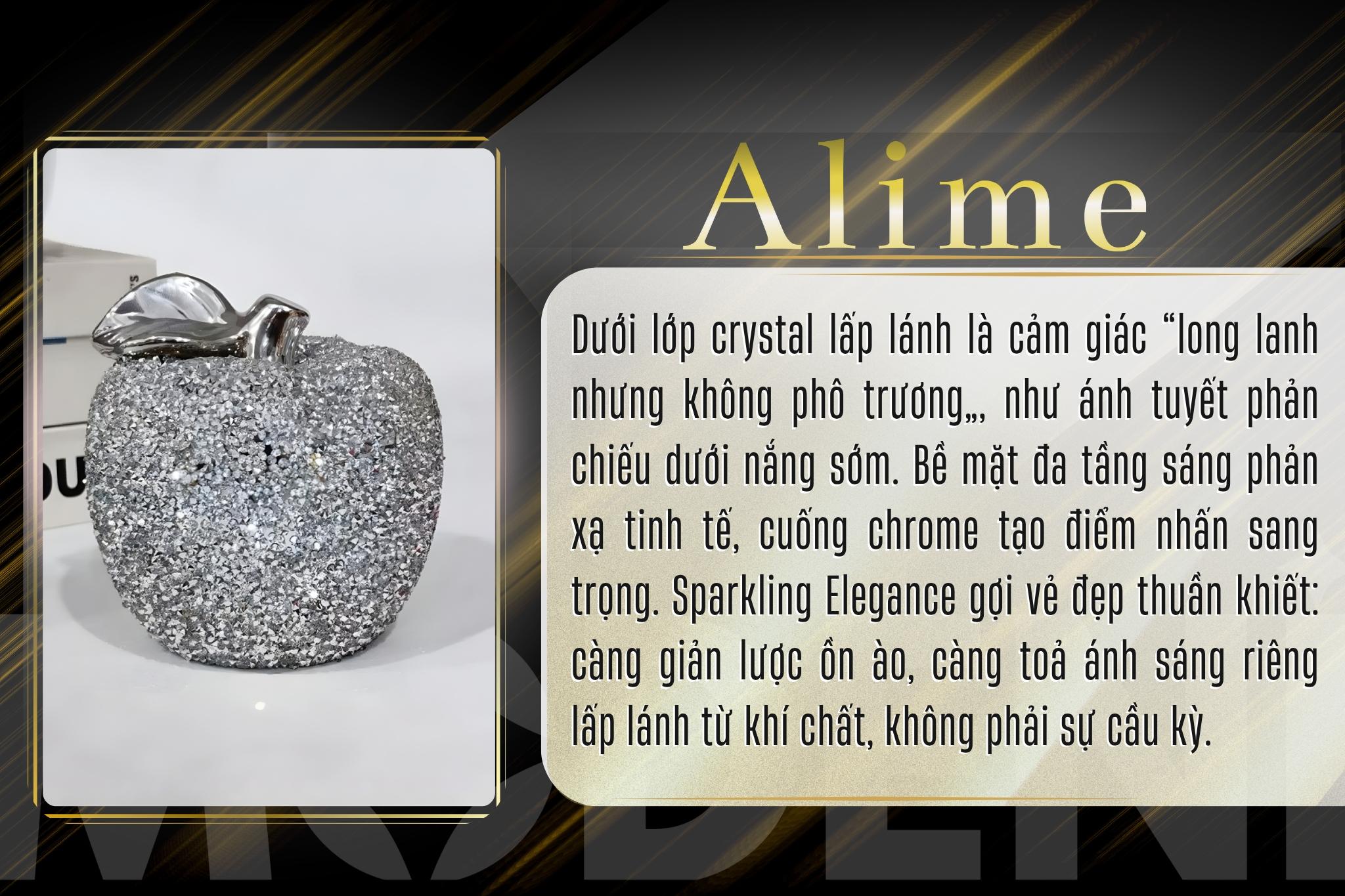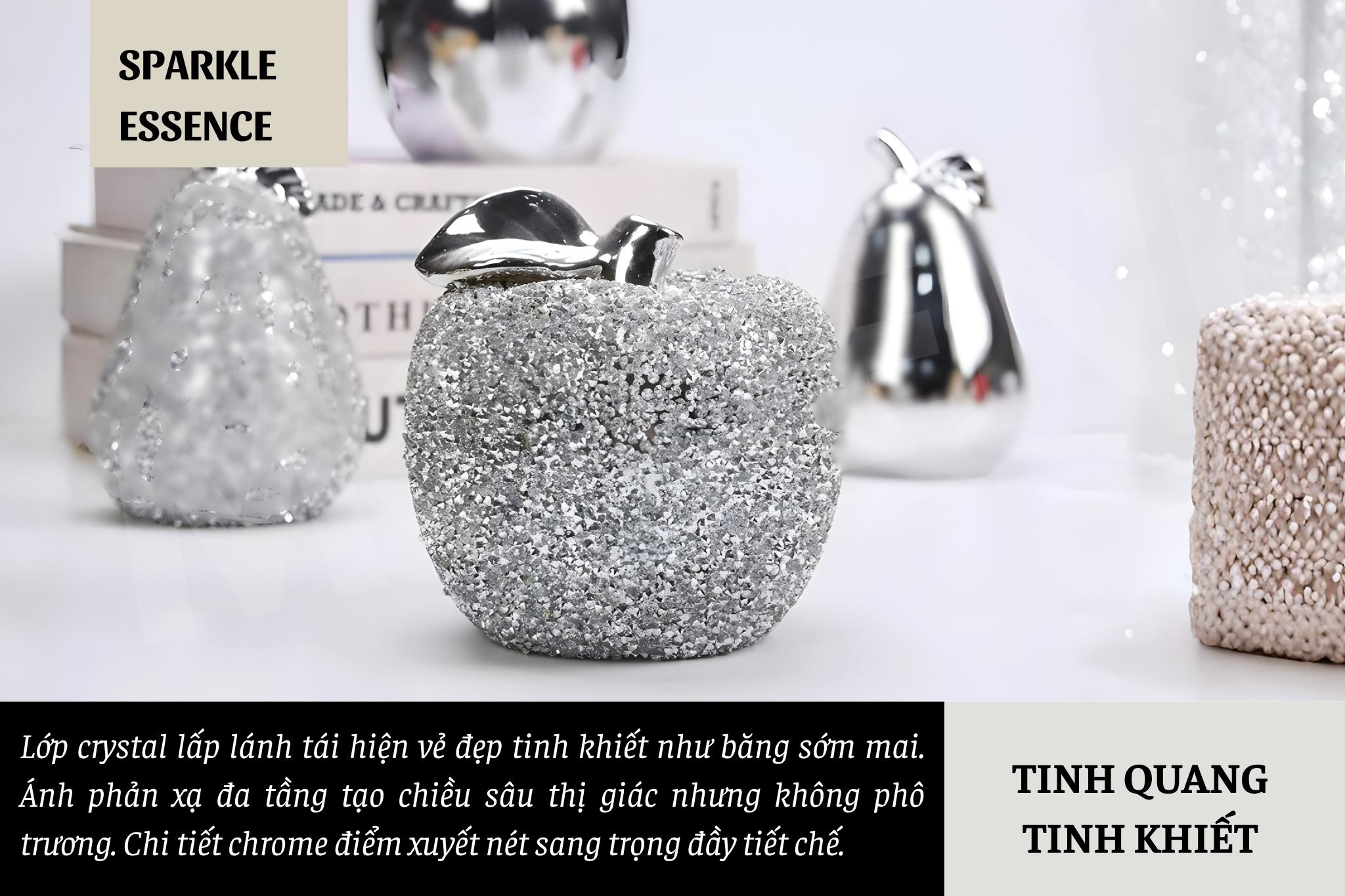 Bề mặt phủ đá crystal nhân tạo lấp lánh, phối phần cuống táo bằng kim loại mạ chrome sáng bóng. |