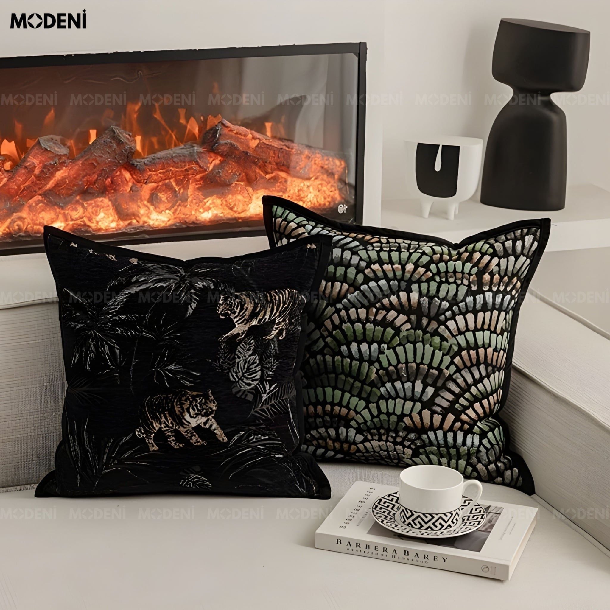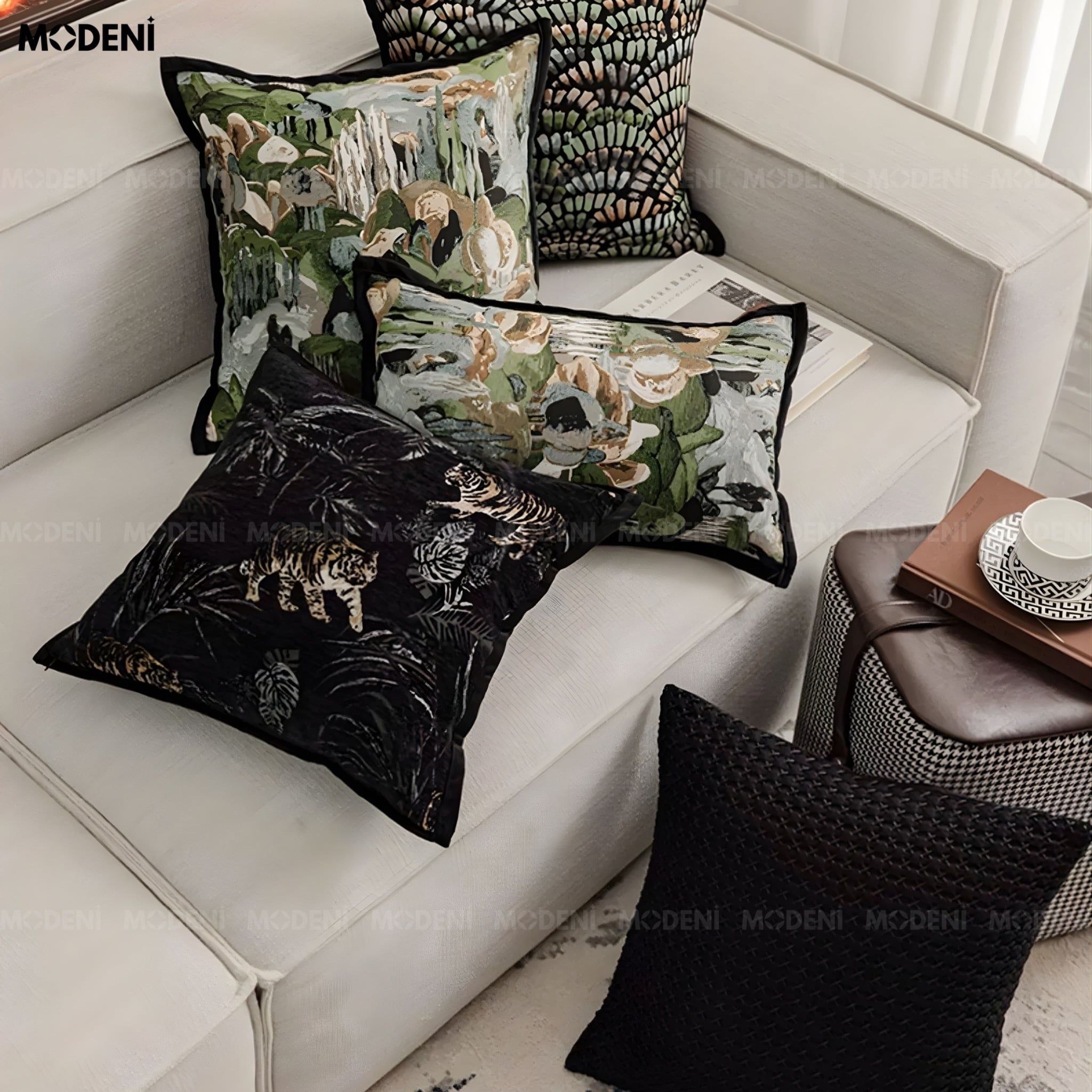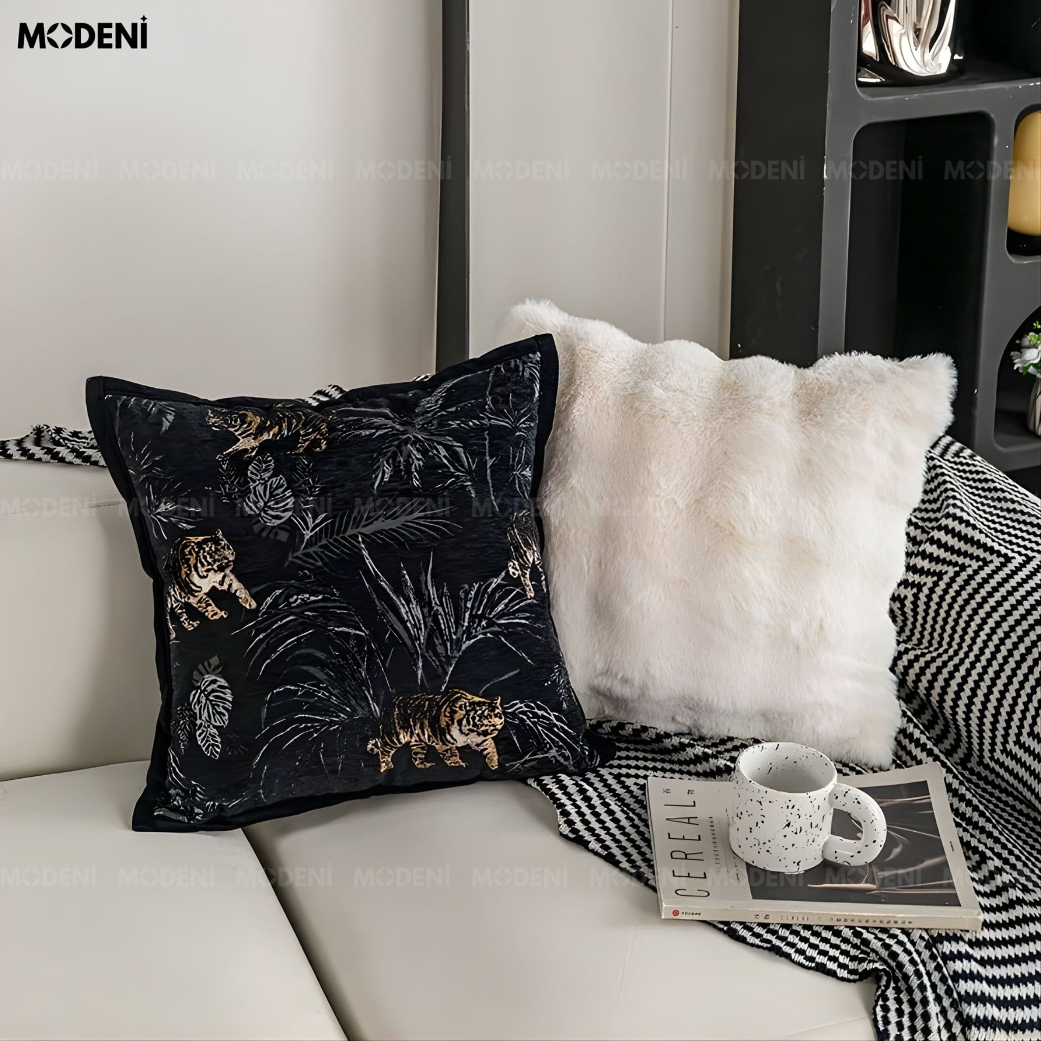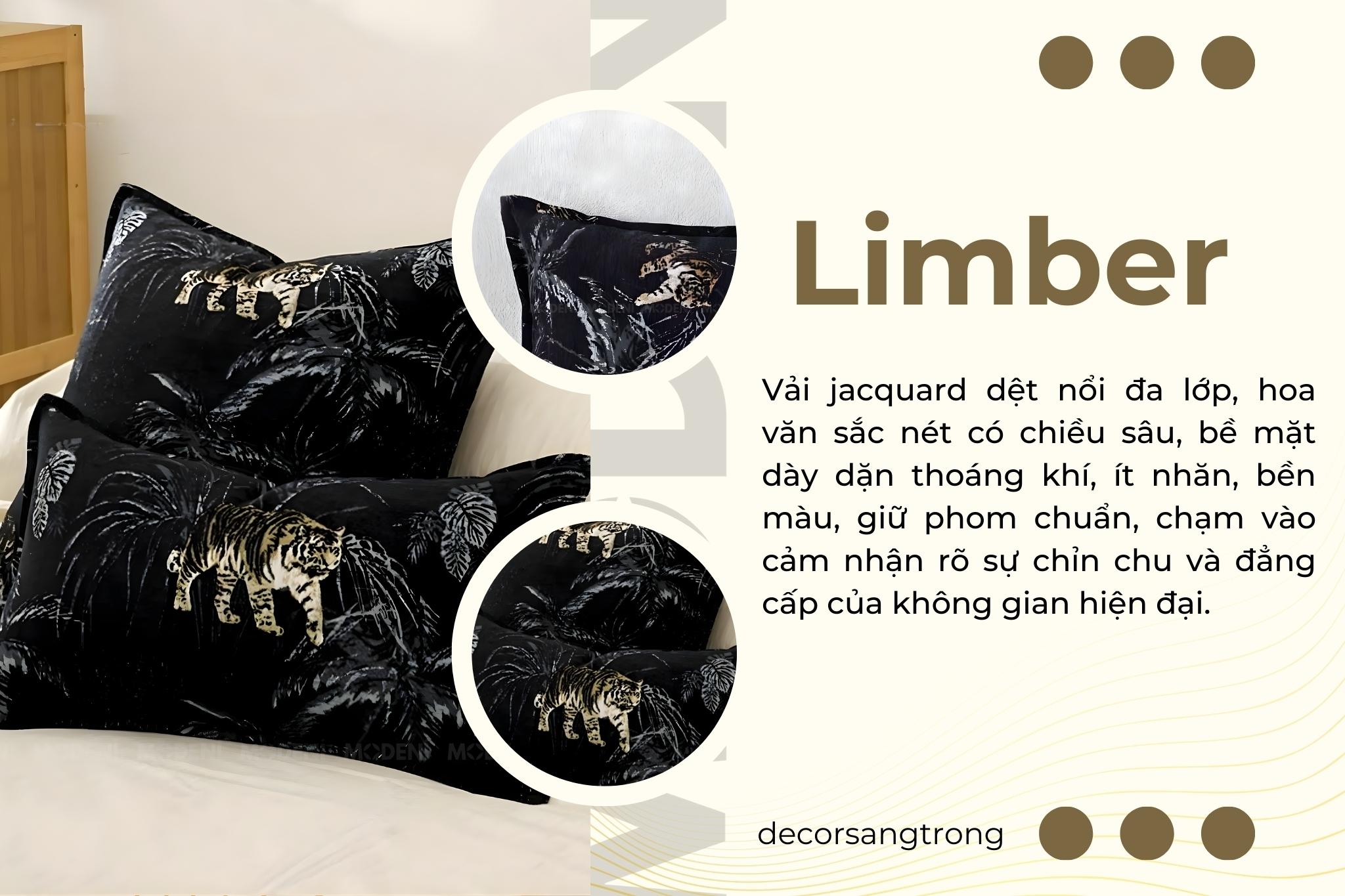 Vỏ Gối Sofa Limber – Vải Jackquard Phối Nhung Họa Tiết Hổ Lá Rừng May Ép Nhiệt Hiện Đại Sang Trọng