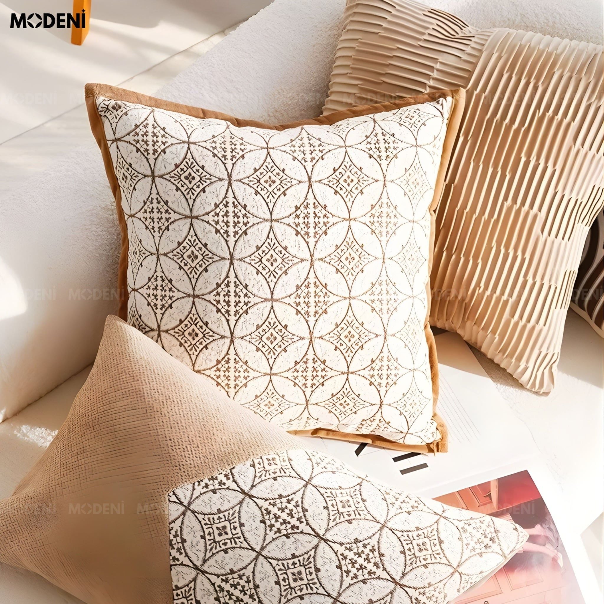 Vỏ Gối Sofa Pathline – Vải Chinelle Phối Nhung Họa Tiết Đồng Xu Thêu Nổi Phong Cách Hiện Đại
