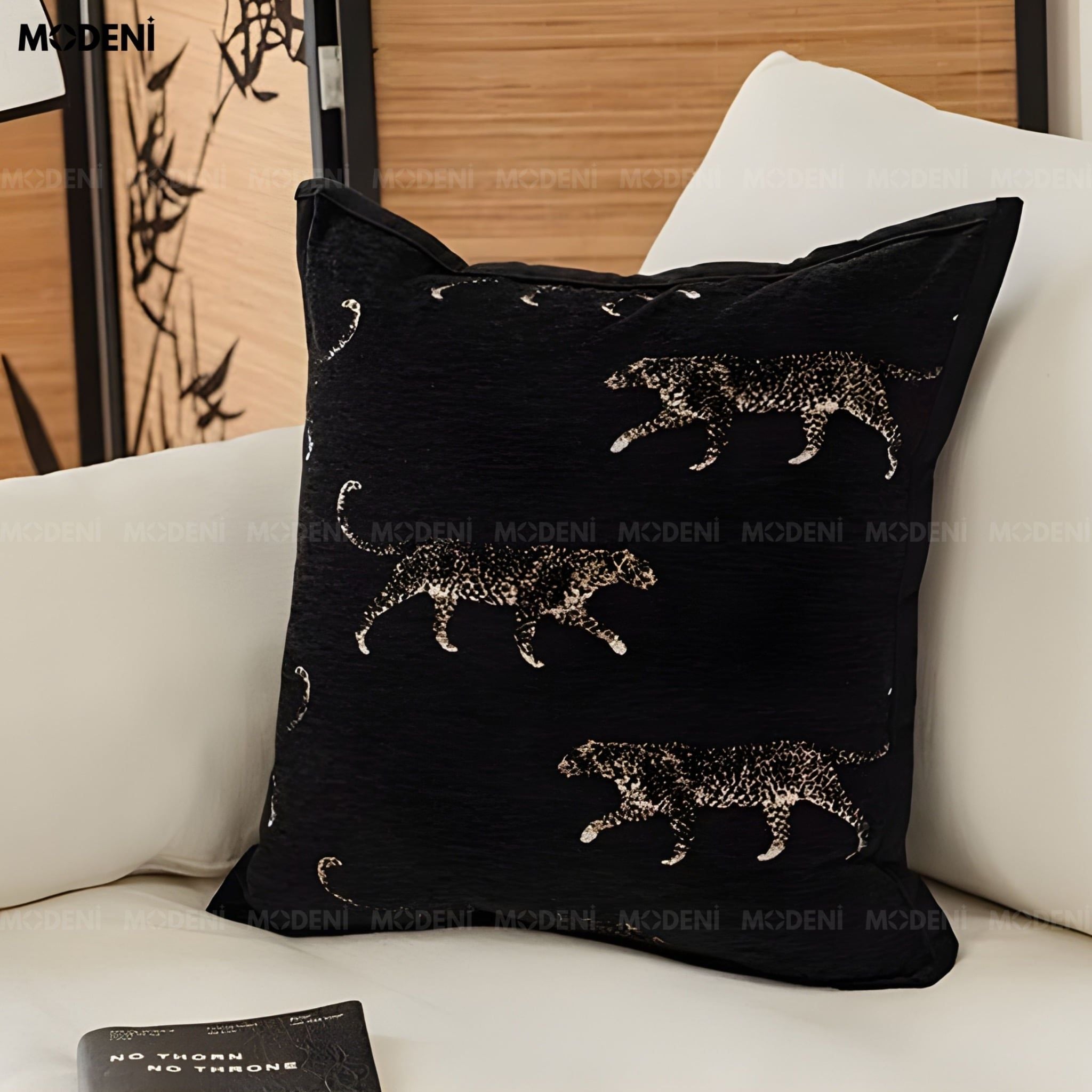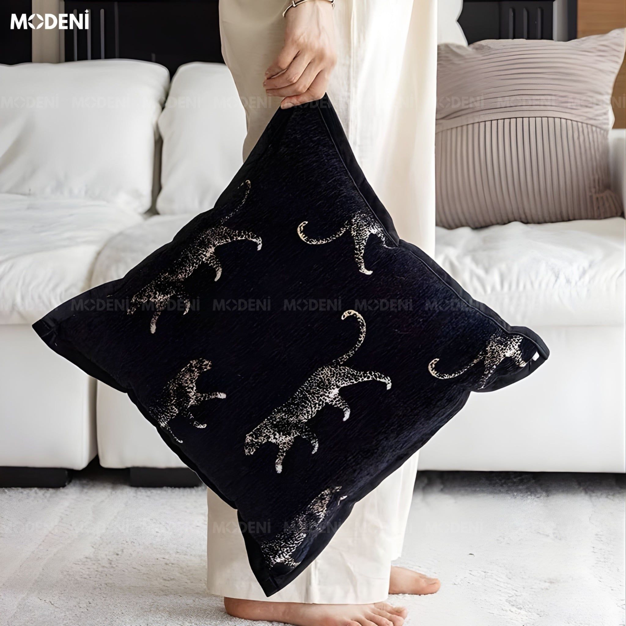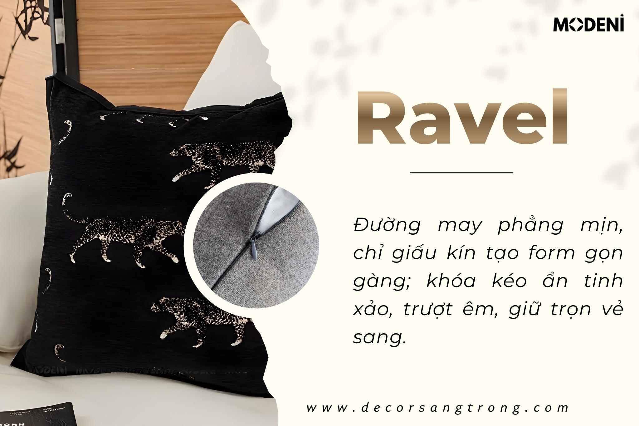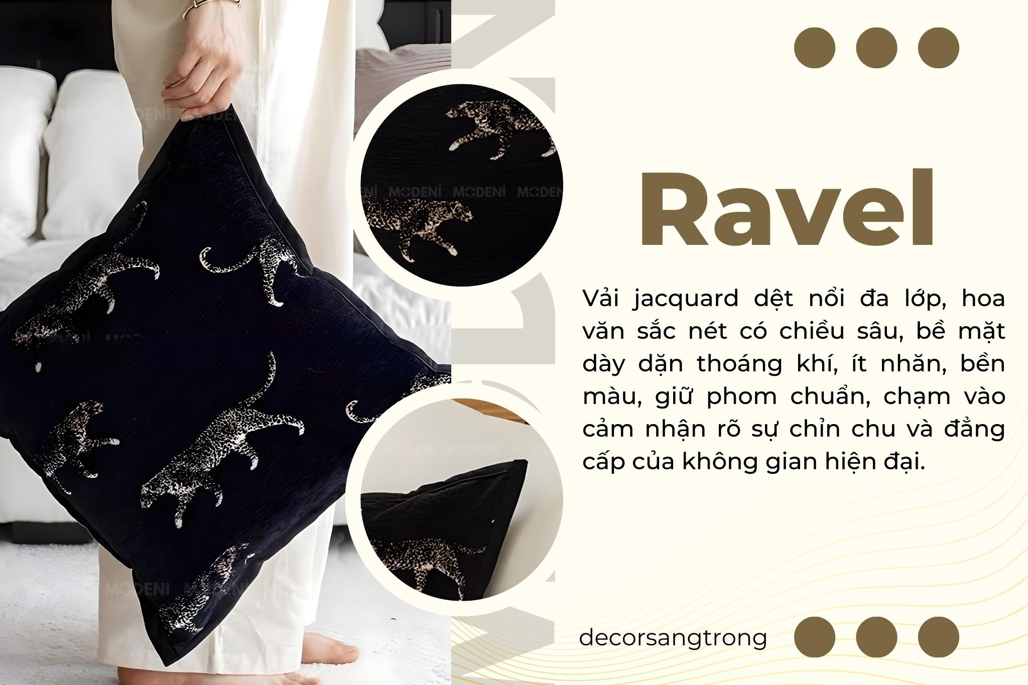 Vỏ Gối Sofa Ravel – Vải Jackquard Phối Nhung Họa Tiết Báo Đen Dập Nổi May Viền Ẩn Hiện Đại