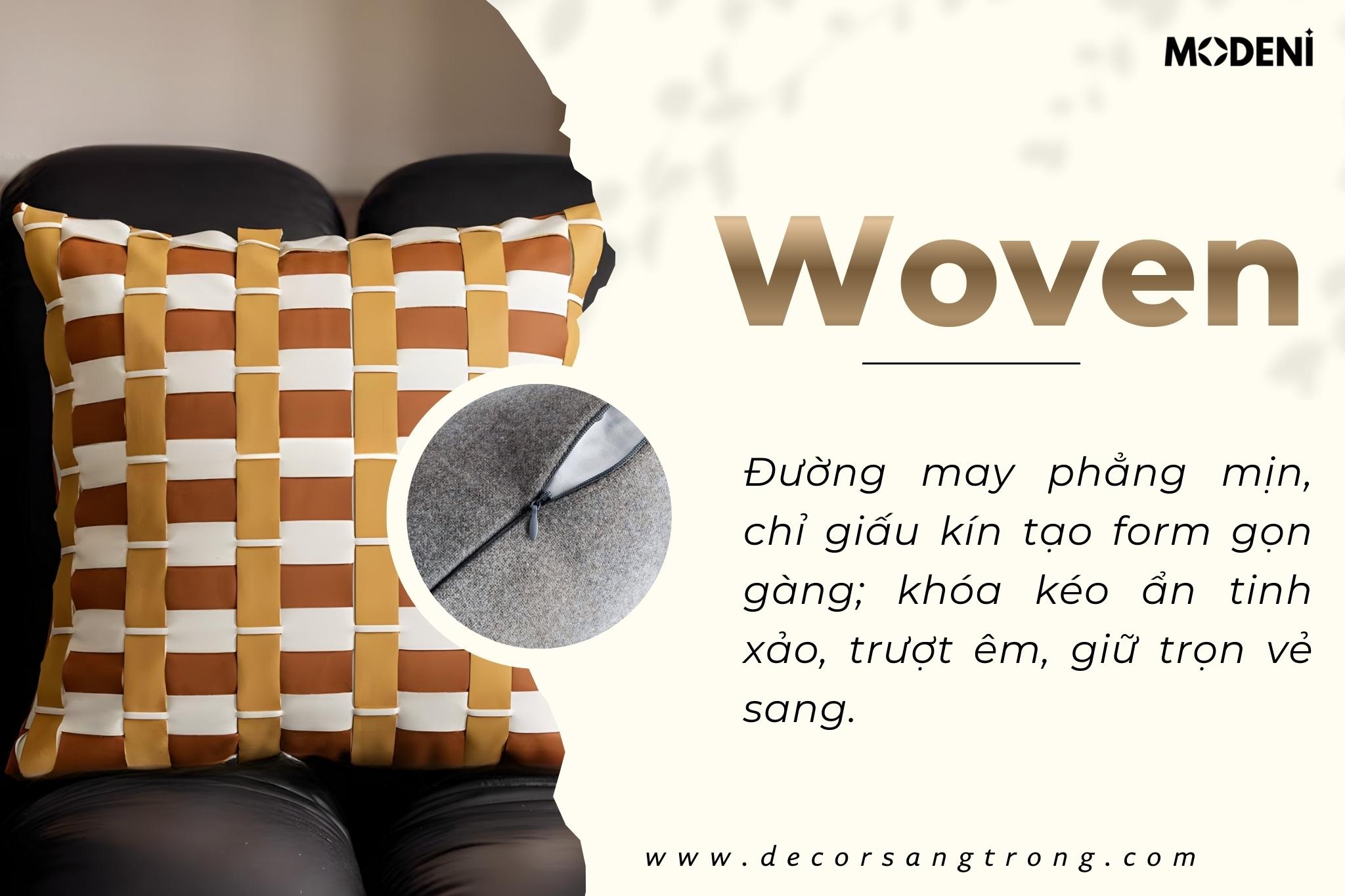 | Kiểu may/ kiểu khóa | Gối caro đan tay tinh xảo, khóa kéo ẩn tinh tế |